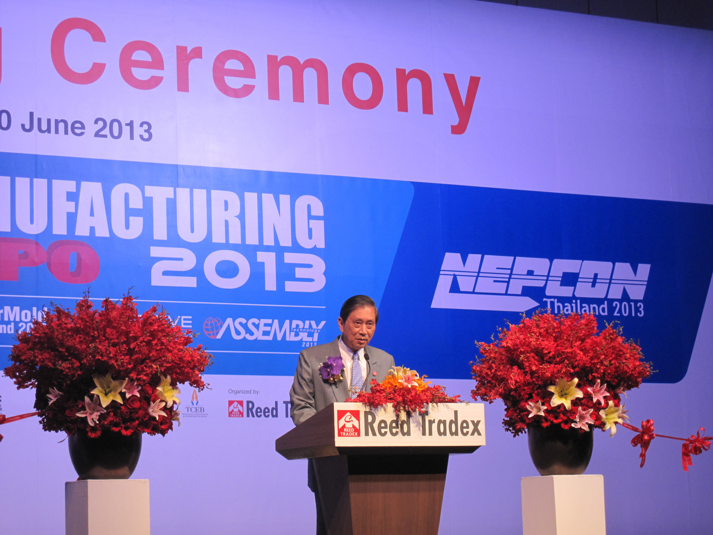 2013年6月20日上午,在泰国模协的安排下,参加亚洲模协联合会的会议代表出席了2013 机械制造技术展览会的开幕式??皇皆谔┕估乐行木傩?,泰国国家副总理H.E. Dr. PlodprasopSuraswadi出席了开幕式并做了重要讲话。来自泰国和其他国家的嘉宾出席了开幕式。