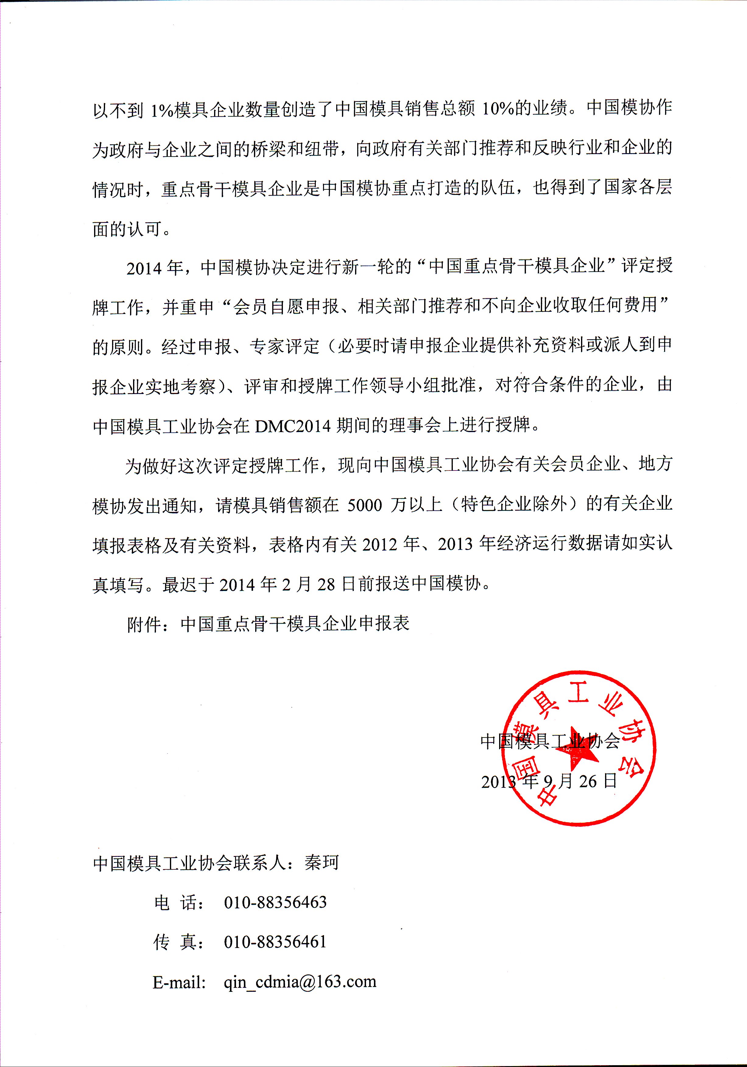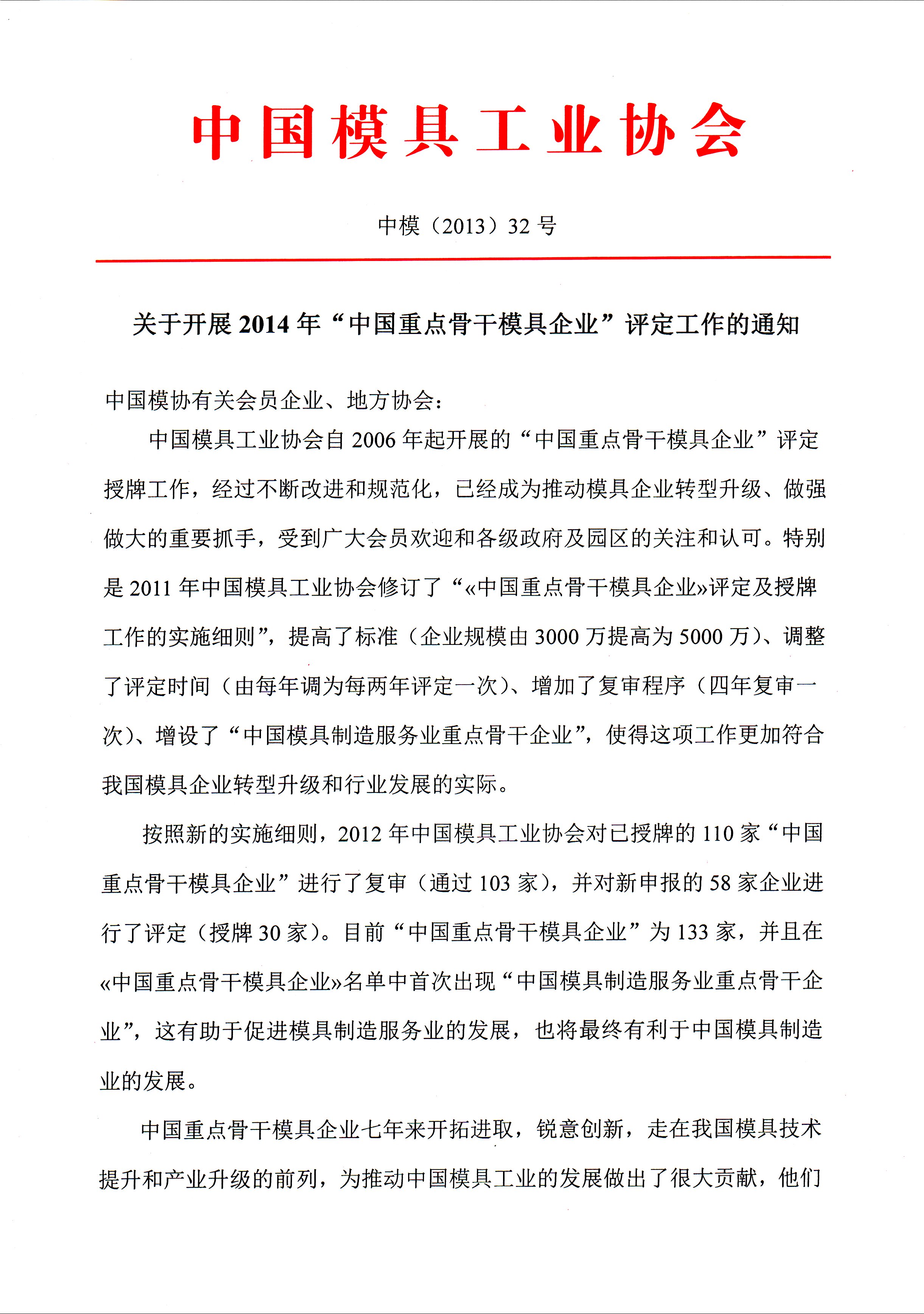 关于开展2014年“中国重点骨干模具企业”评定工作的通知