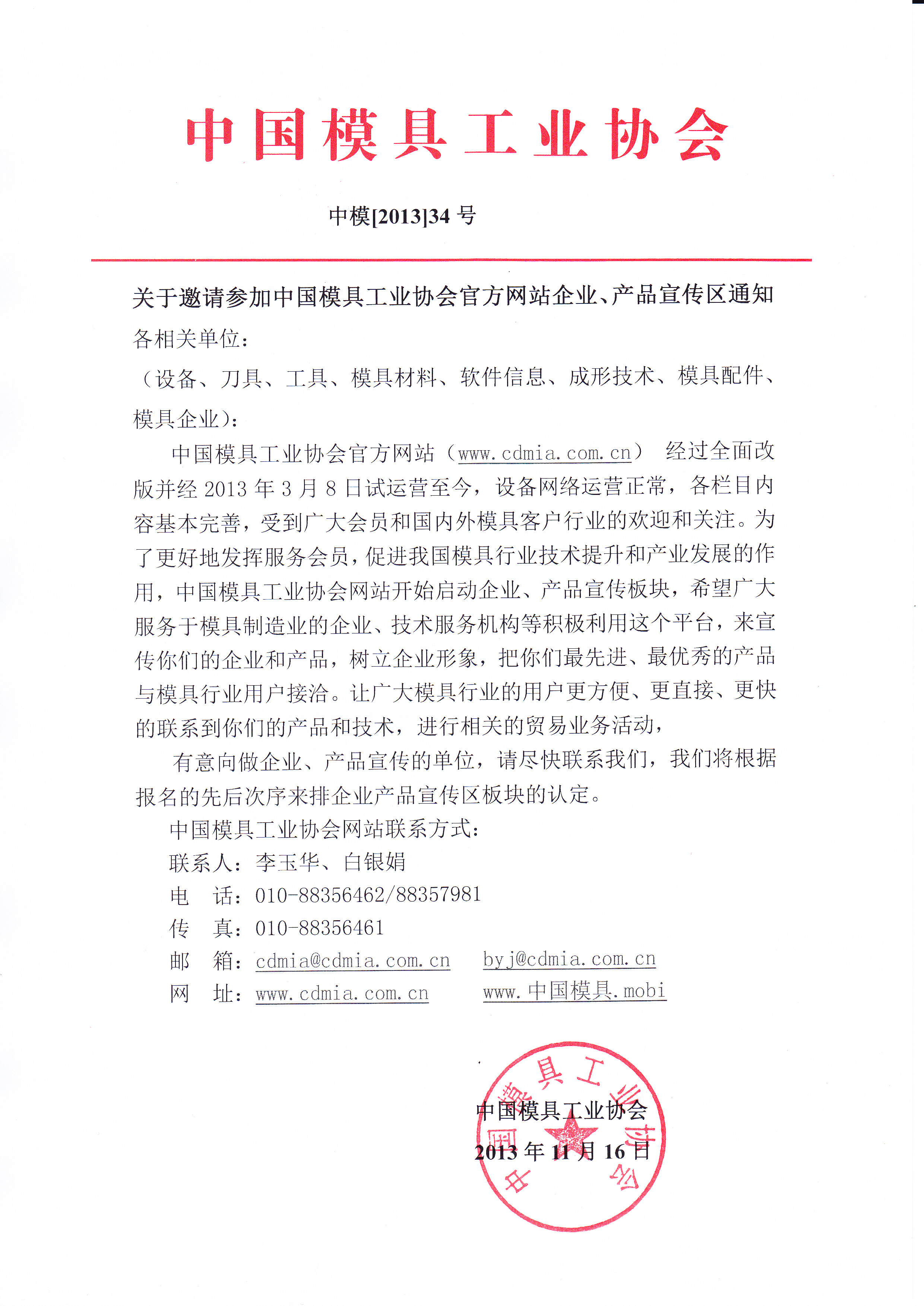 关于邀请参加中国模具工业协会官方网站企业、产品宣传区通知