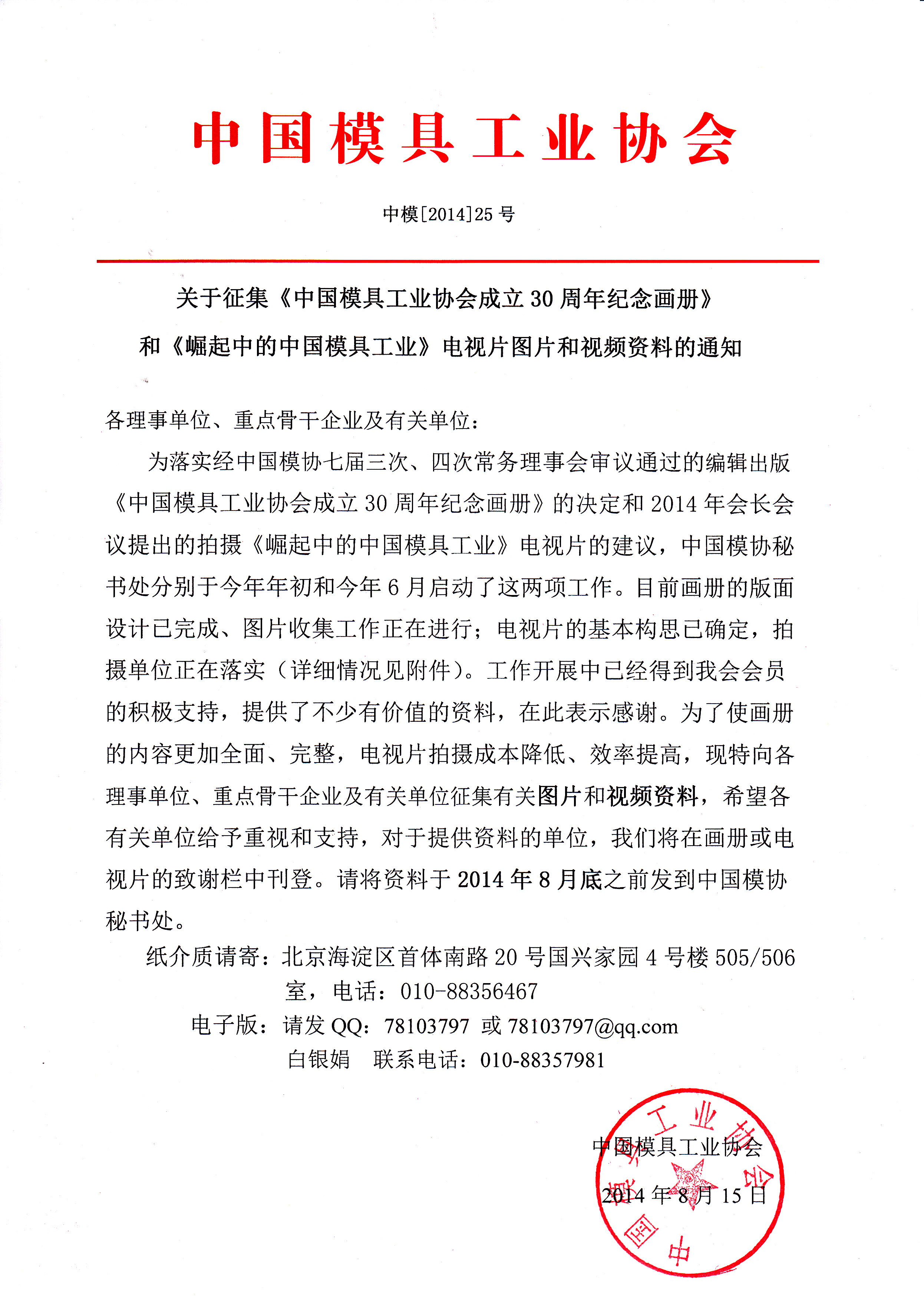 关于征集《中国模具工业协会成立30周年纪念画册》和《崛起中的中国模具工业》电视片图片和视频资料的通知