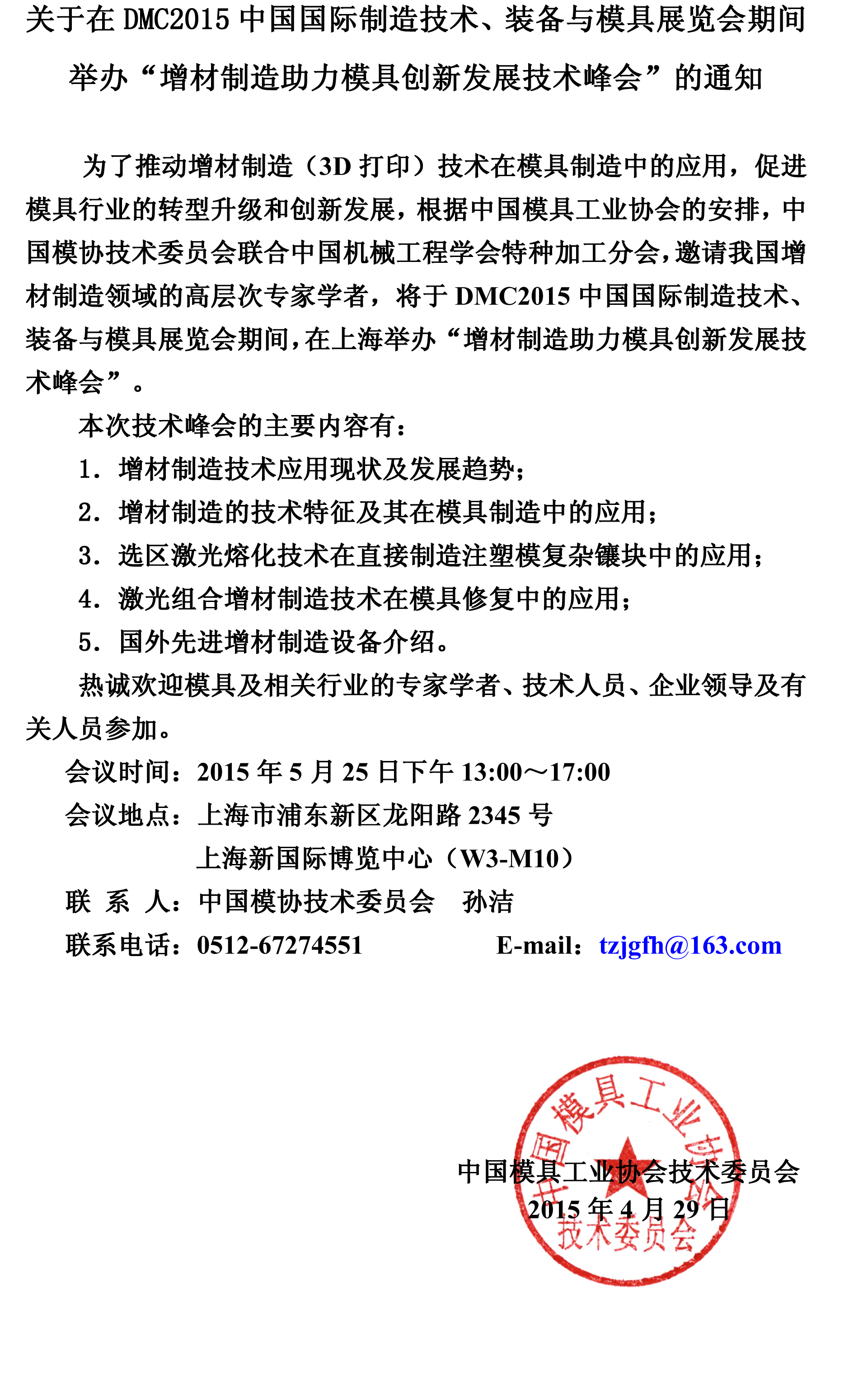 关于在DMC2015中国国际制造技术、装备与模具展览会期间举办“增材制造助力模具创新发展技术峰会”的通知