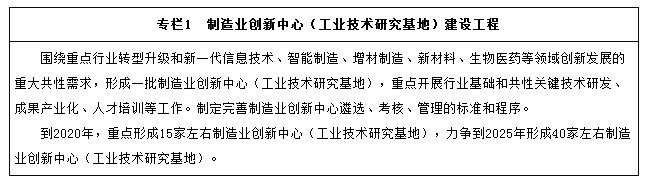 完善国家制造业创新体系。加强顶层设计,加快建立以创新中心为核心载体、以公共服务平台和工程数据中心为重要支撑的制造业创新网络,建立市场化的创新方向选择机制和鼓励创新的风险分担、利益共享机制。充分利用现有科技资源,围绕制造业重大共性需求,采取政府与社会合作、政产学研用产业创新战略联盟等新机制新模式,形成一批制造业创新中心(工业技术研究基地),开展关键共性重大技术研究和产业化应用示范。建设一批促进制造业协同创新的公共服务平台,规范服务标准,开展技术研发、检验检测、技术评价、技术交易、质量认证、人才培训等专业化服务,促进科技成果转化和推广应用。建设重点领域制造业工程数据中心,为企业提供创新知识和工程数据的开放共享服务。面向制造业关键共性技术,建设一批重大科学研究和实验设施,提高核心企业系统集成能力,促进向价值链高端延伸。