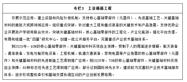 加强“四基”创新能力建设。强化前瞻性基础研究,着力解决影响核心基础零部件(元器件)产品性能和稳定性的关键共性技术。建立基础工艺创新体系,利用现有资源建立关键共性基础工艺研究机构,开展先进成型、加工等关键制造工艺联合攻关;支持企业开展工艺创新,培养工艺专业人才。加大基础专用材料研发力度,提高专用材料自给保障能力和制备技术水平。建立国家工业基础数据库,加强企业试验检测数据和计量数据的采集、管理、应用和积累。加大对“四基”领域技术研发的支持力度,引导产业投资基金和创业投资基金投向“四基”领域重点项目。
