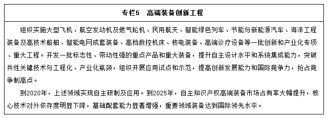 航空装备。加快大型飞机研制,适时启动宽体客机研制,鼓励国际合作研制重型直升机;推进干支线飞机、直升机、无人机和通用飞机产业化。突破高推重比、先进涡桨(轴)发动机及大涵道比涡扇发动机技术,建立发动机自主发展工业体系。开发先进机载设备及系统,形成自主完整的航空产业链。