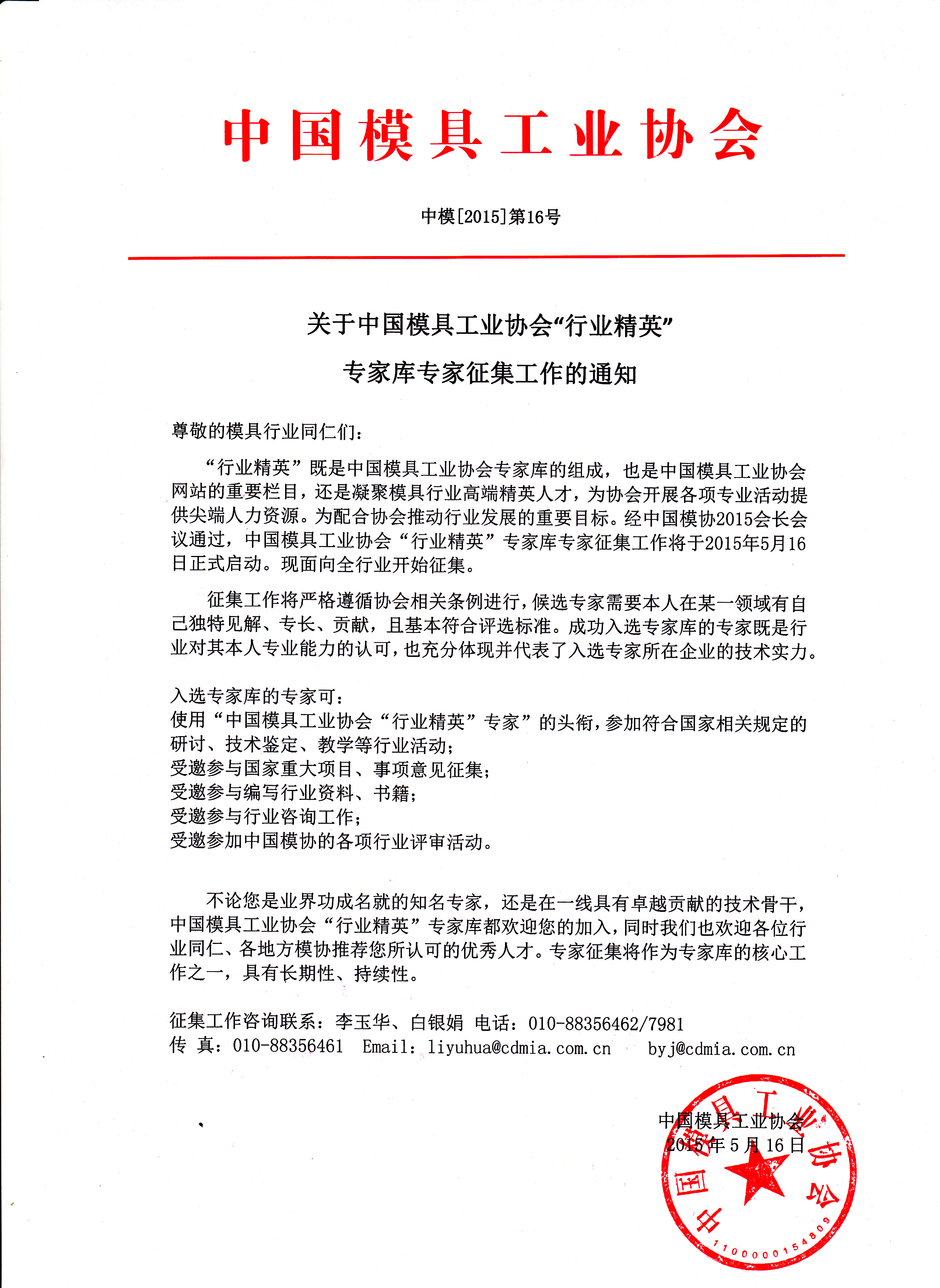 关于中国模具工业协会“行业精英”专家库专家征集工作的通知
