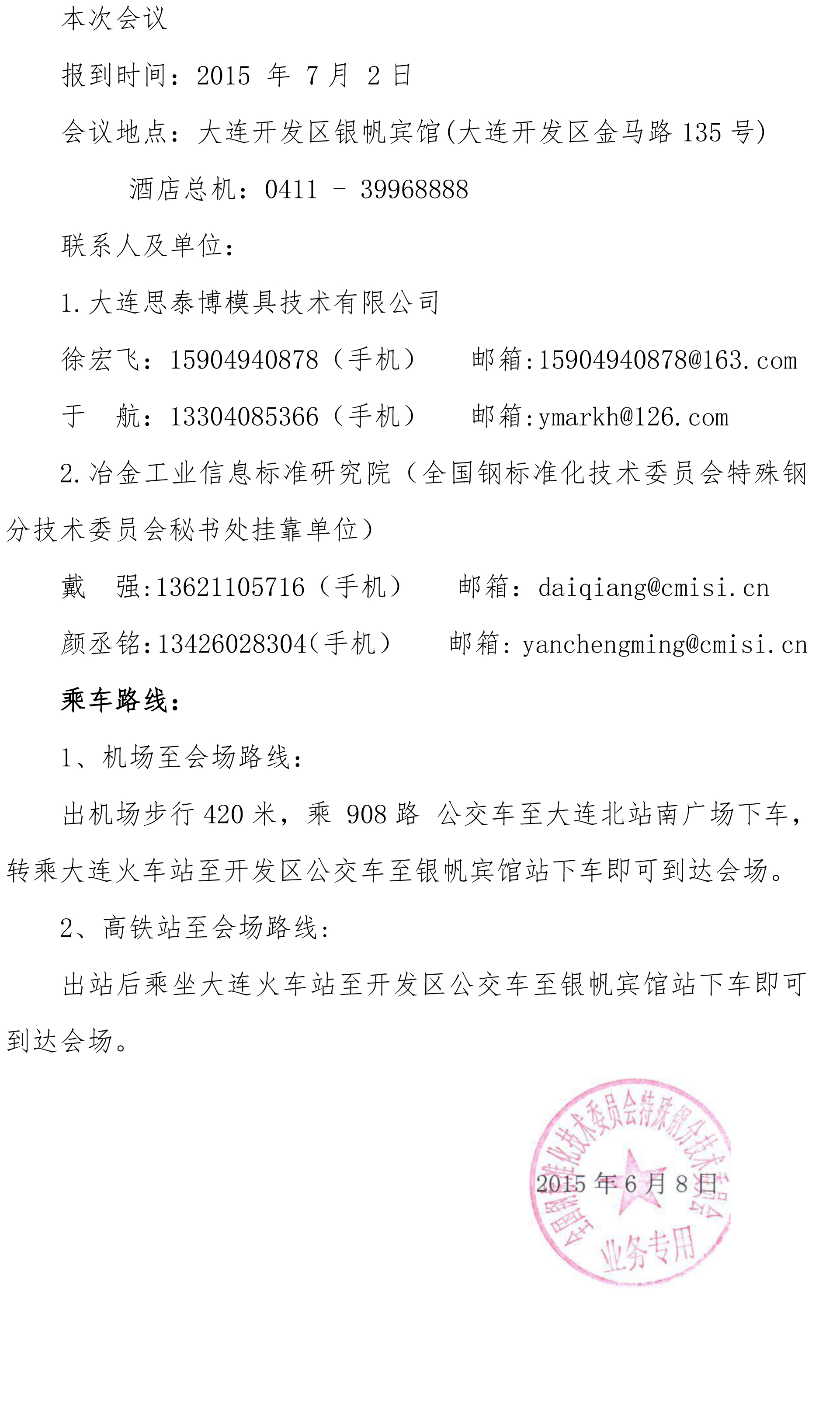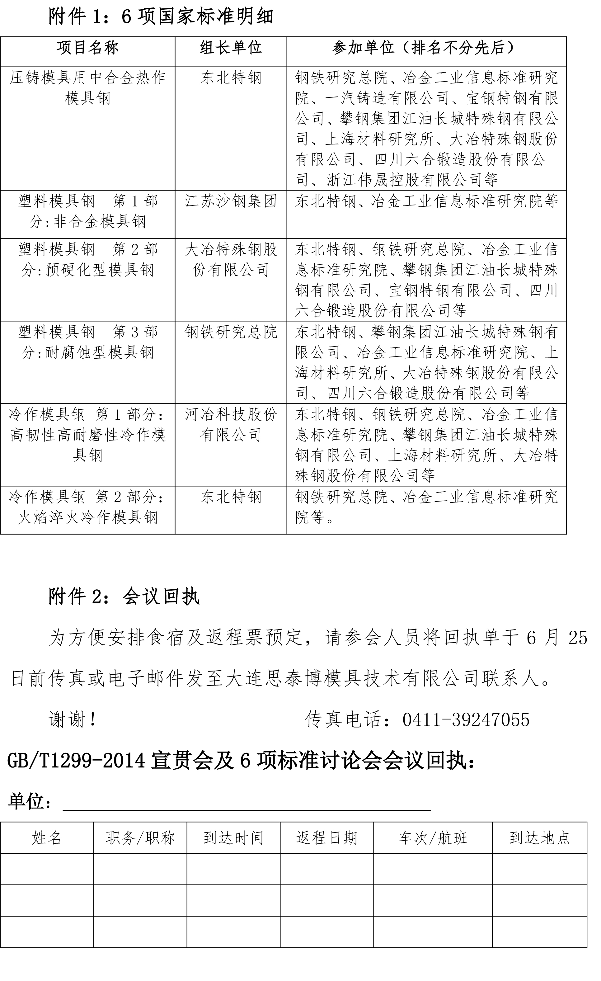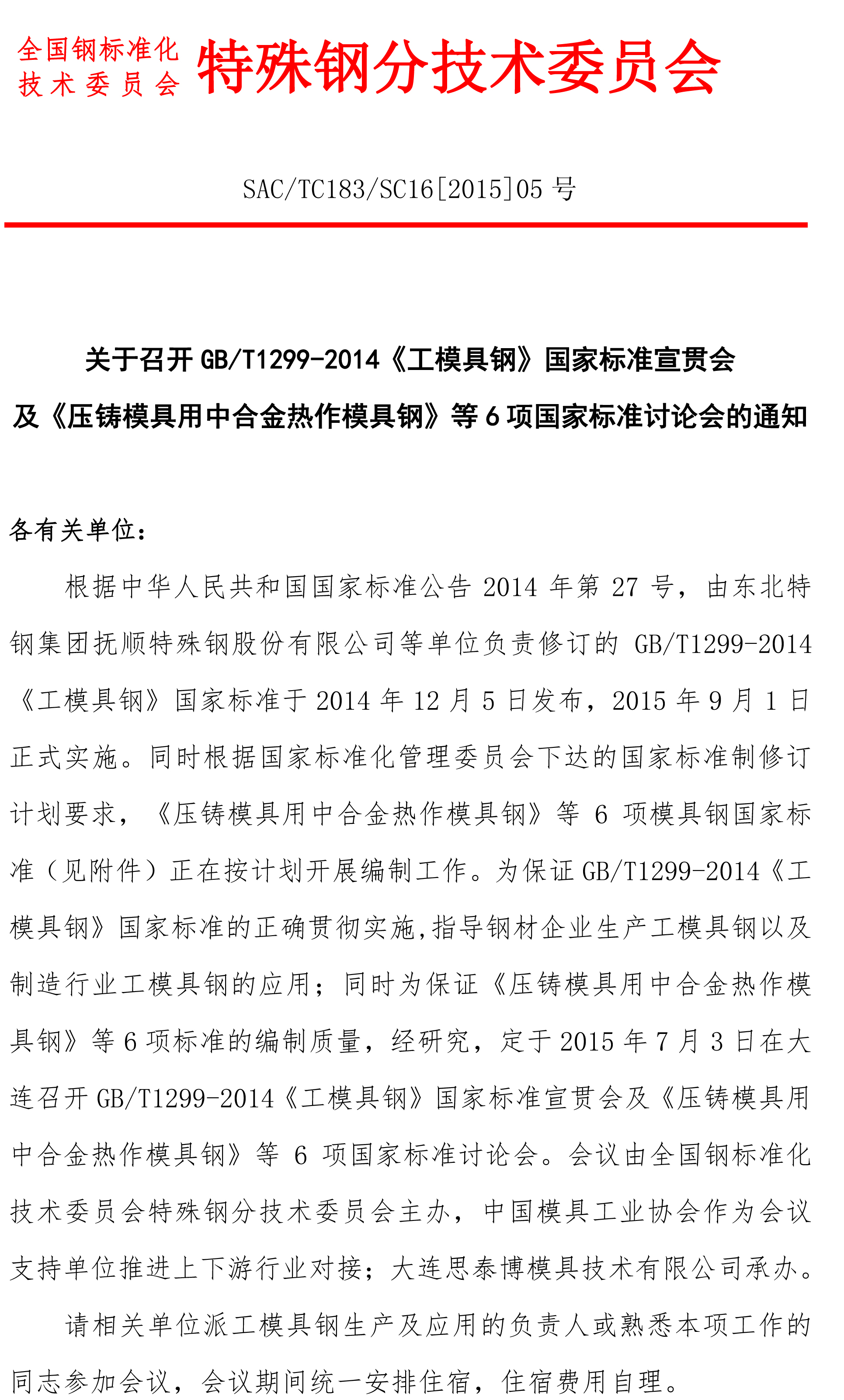 关于召开GB/T1299-2014《工模具钢》国家标准宣贯会及《压铸模具用中合金热作模具钢》等6项国家标准讨论会的通知