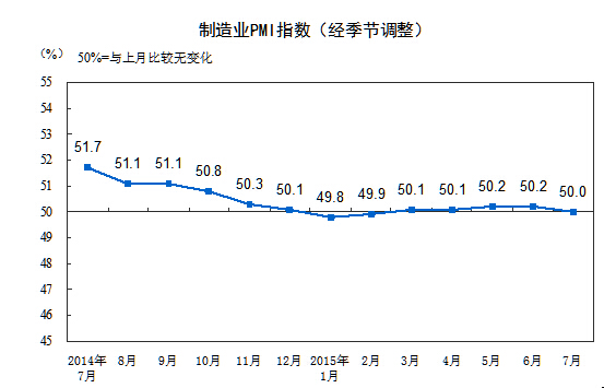 统计局:7月中国制造业PMI为50.0% 位于临界点