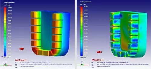 该案例中冷却通道十分长而且贴近模具表面,带来了极佳的冷却效果,使得模具周期减少了15%到45%,并且提高了最终产品的质量。
