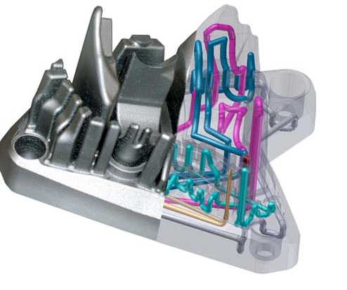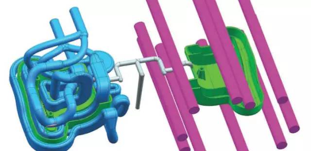 随形冷却是复杂模具设计的首选方式,如果冷却水路距模具表面较近,则模具中积累的热量就会大大减少,且热量被限制在冷却水道与模具表面之间的区域,使得从模具型腔表面向冷却水路传导热量的路径也缩短很多。冷却通道可以被设计成复杂的异形,管道直径可以不断变化,根据冷却要求,横截面也可以是椭圆形或者方形。使用正确的计算和冷却分析可以极大地优化模具冷却方式,从而缩短模具周期,提高部件质量,特别是在易失真和变形区域。