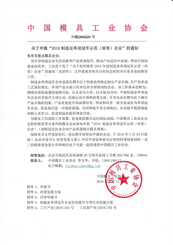关于申报“2016制造业单项冠军示范(培育)企业”的通知