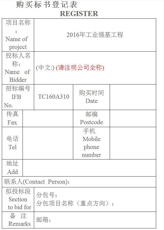 3、招标文件每包600元人民币,售出不退,没有购买招标文件的投标将被视为无效投标而被否决。如需邮购,请按我公司相关财务信息汇款,汇款单上应注明汇款用途、所购招标文件编号/包号,然后将汇款单复印件,购买单位名称、详细通讯地址、邮编、办公电话、手机、传真及联系人等内容传真给我公司(详见“购买标书登记表”附后),我公司收到传真后将尽快以快递方式将招标文件邮寄给贵单位,如需要可提供所购招标文件电子版。