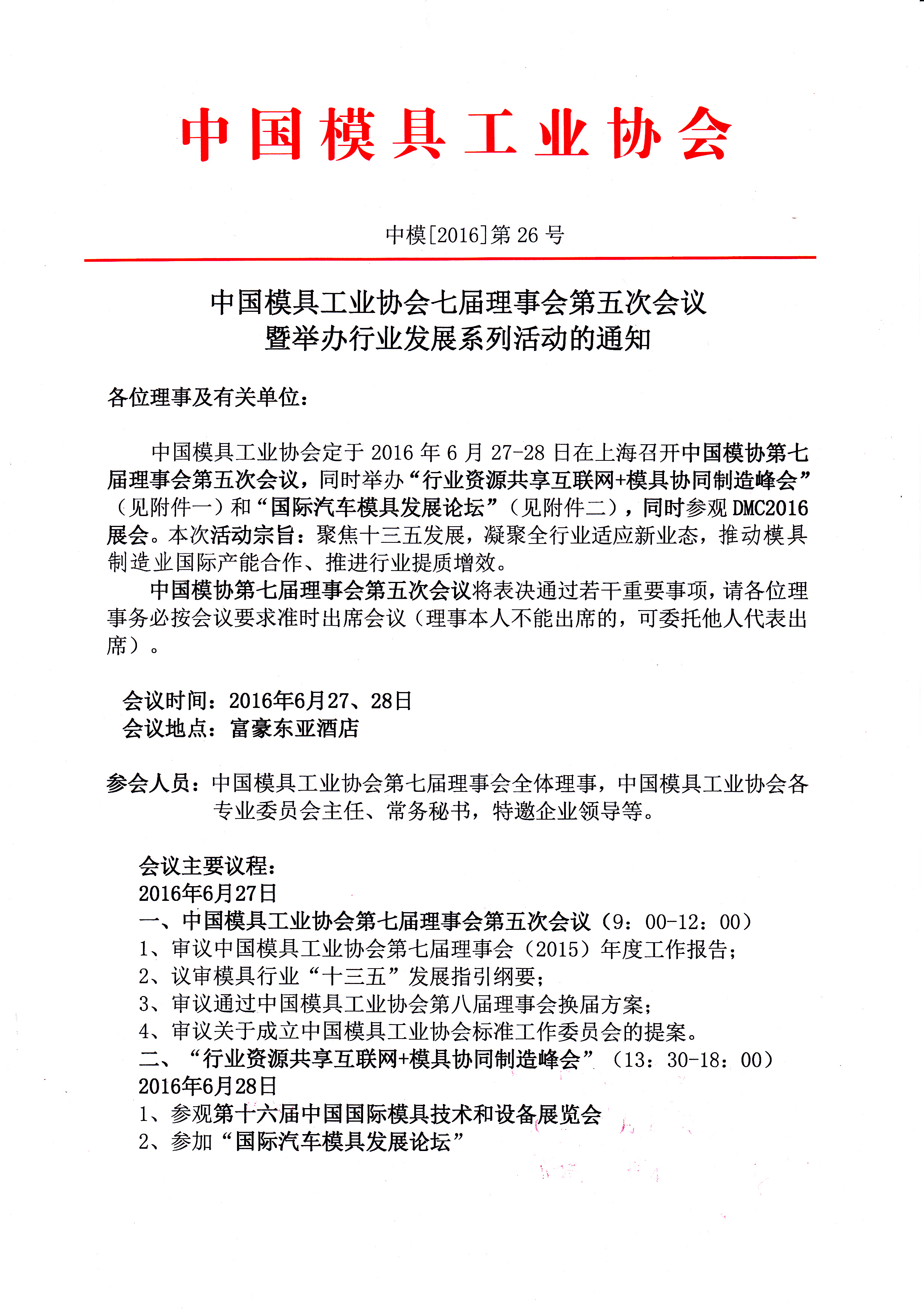中国模具工业协会七届理事会第五次会议暨举办行业发展系列活动的通知