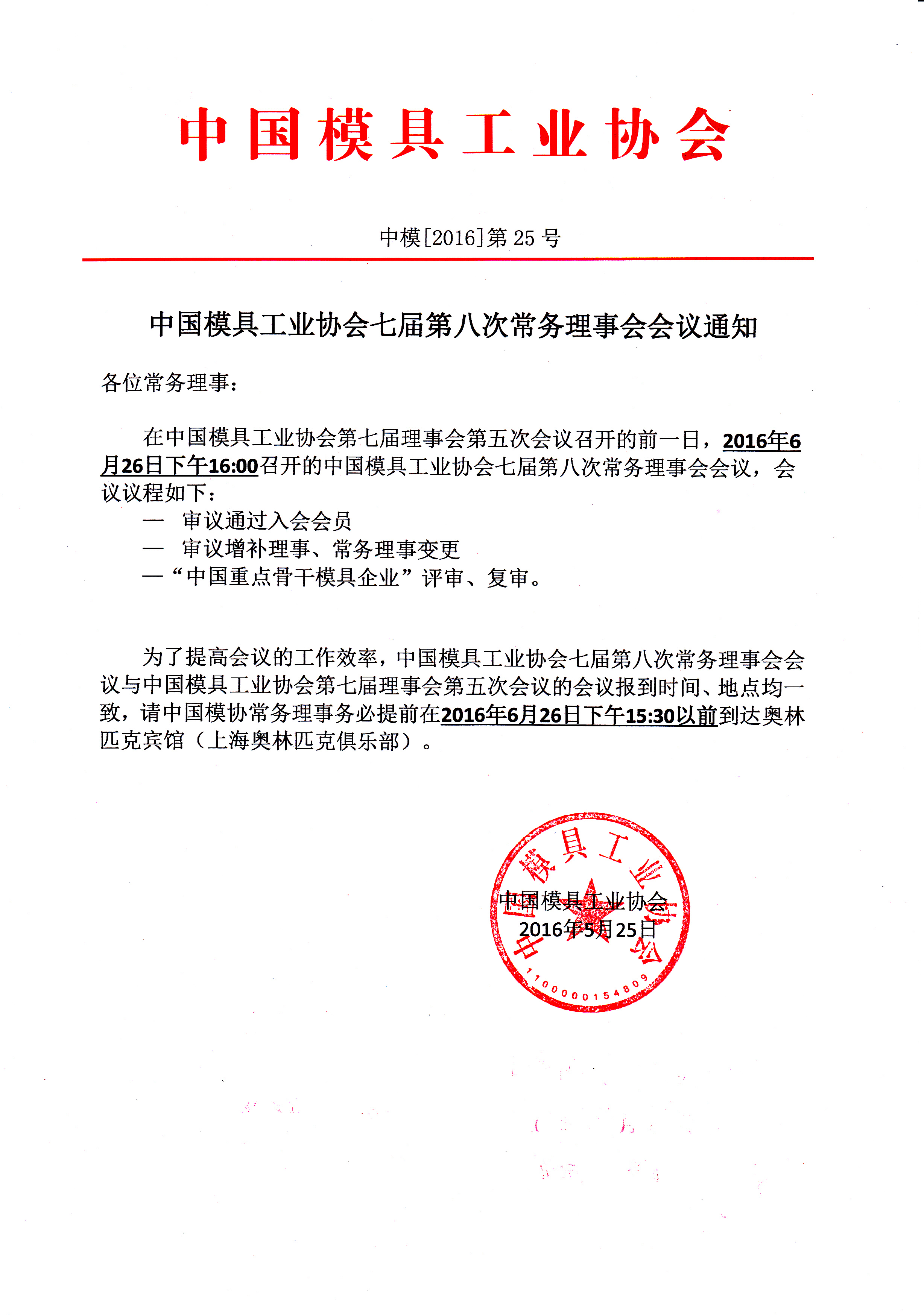 中国模具工业协会七届第八次常务理事会会议通知