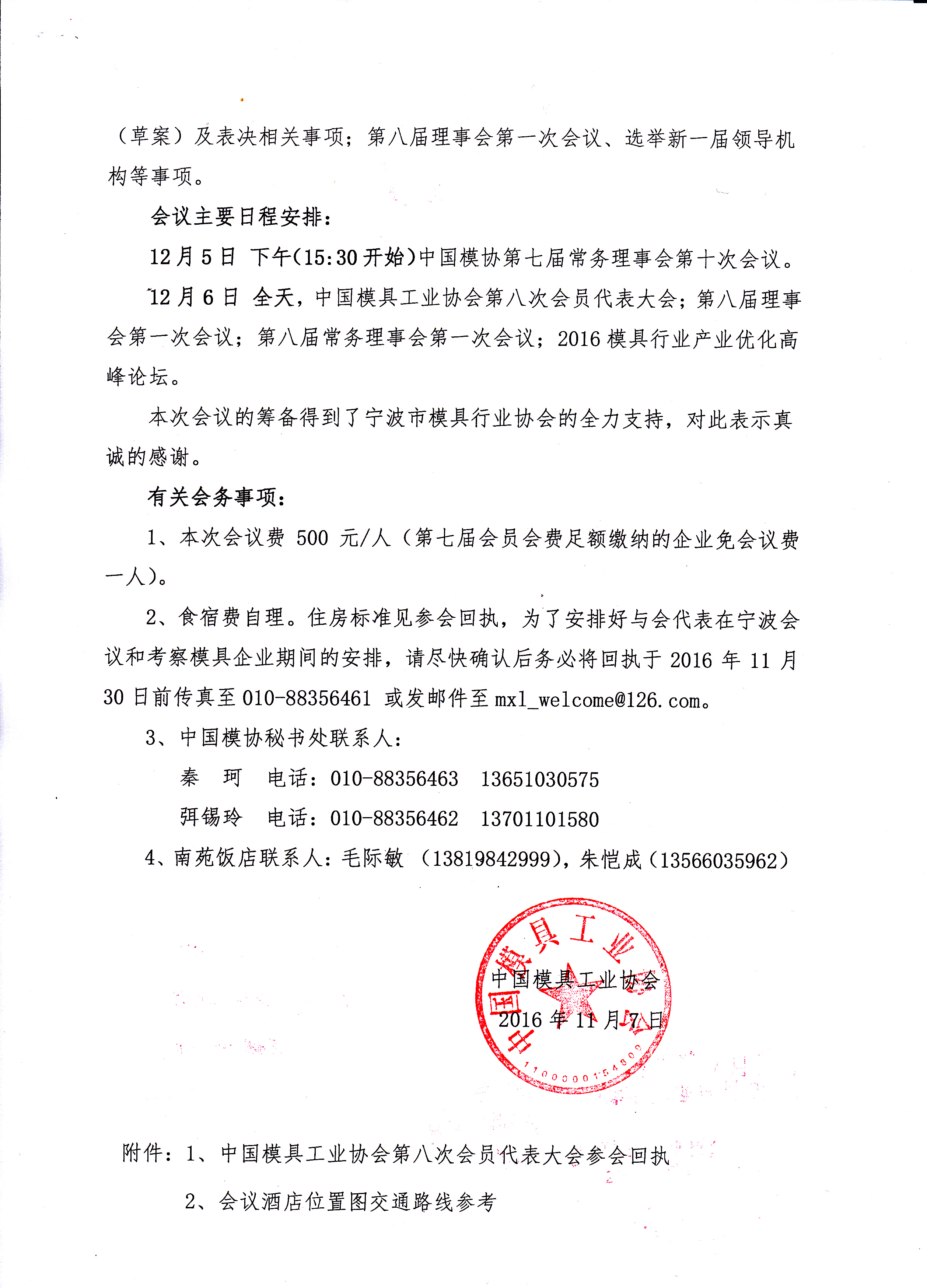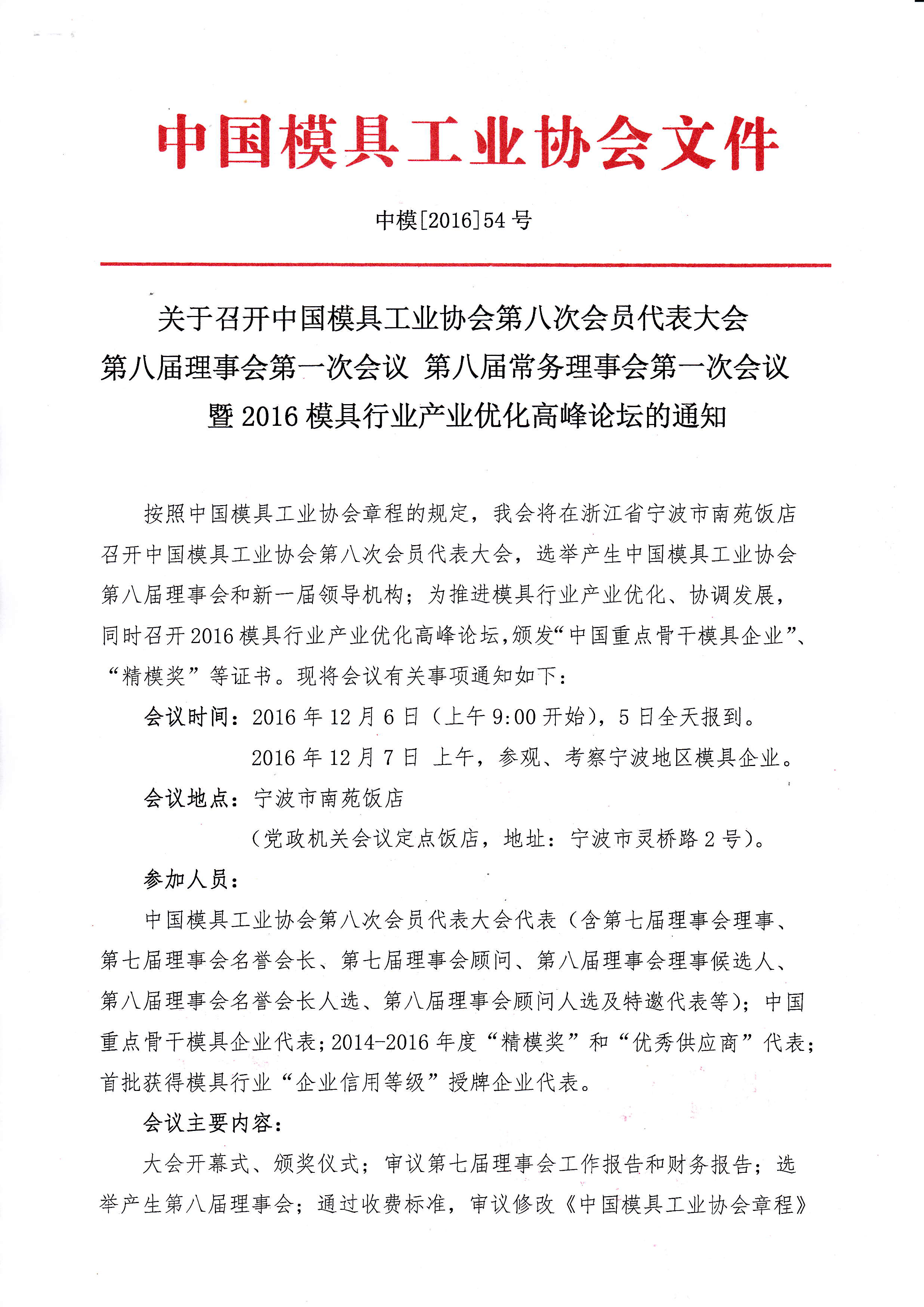 关于召开中国模具工业协会第八次会员代表大会第八届理事会第一次会议 第八届常务理事会第一次会议暨2016模具行业产业优化高峰论坛的通知 |