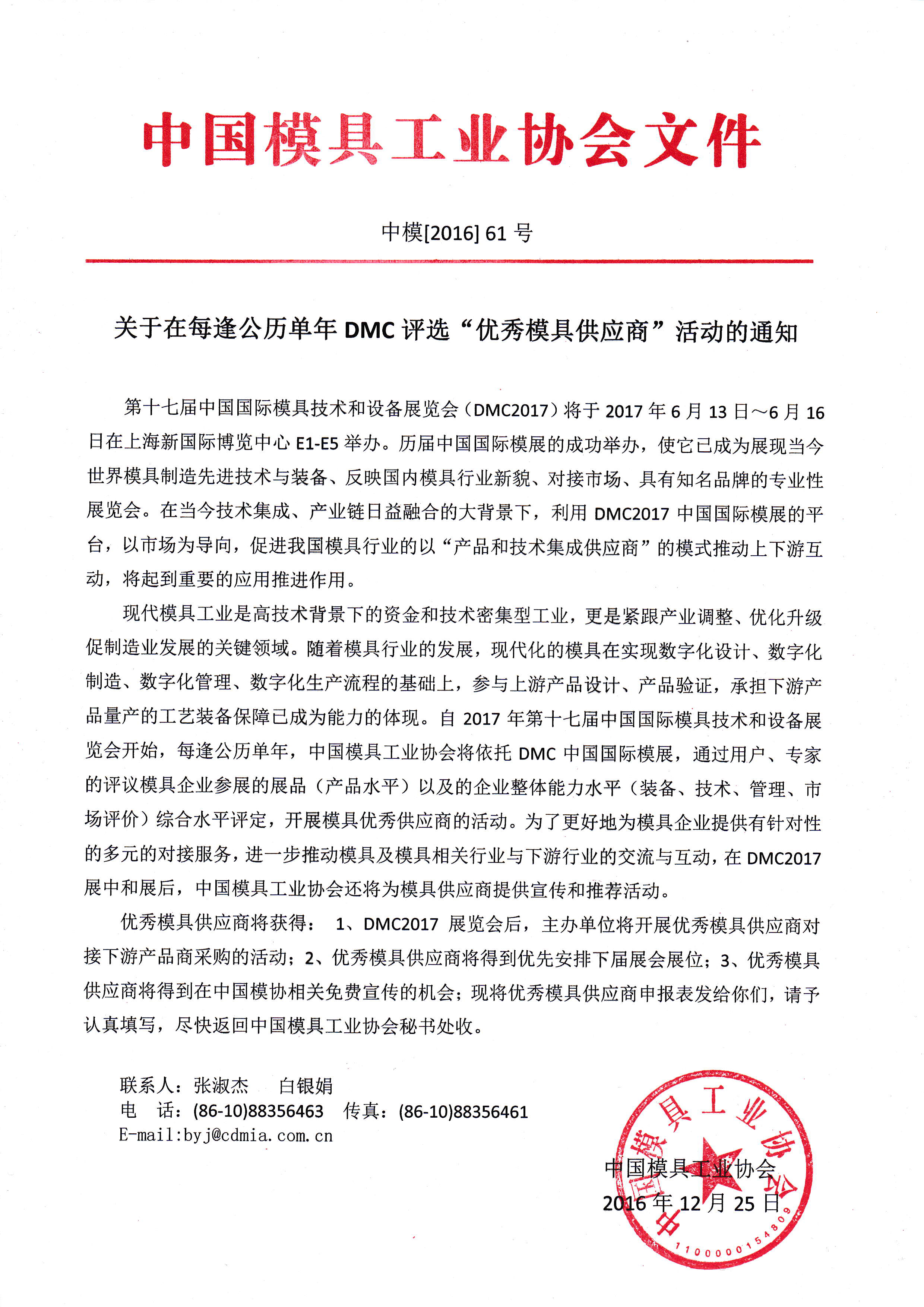 关于在每逢公历单年DMC评选“优秀模具供应商”活动的通知