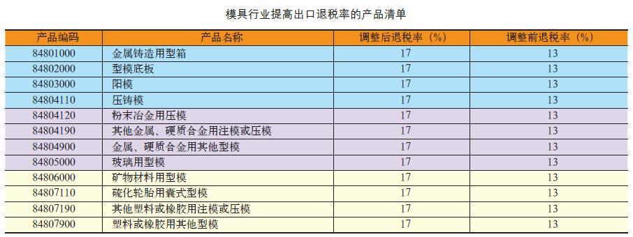 动机、汽油、航空煤油、柴油等产品的出口退税率提高至17%,并自2016 年11 月1 日起执行。本通知所附《提高出口退税率的产品清单》中,模具行业提高出口退税率的产品清单具体如下表所示: