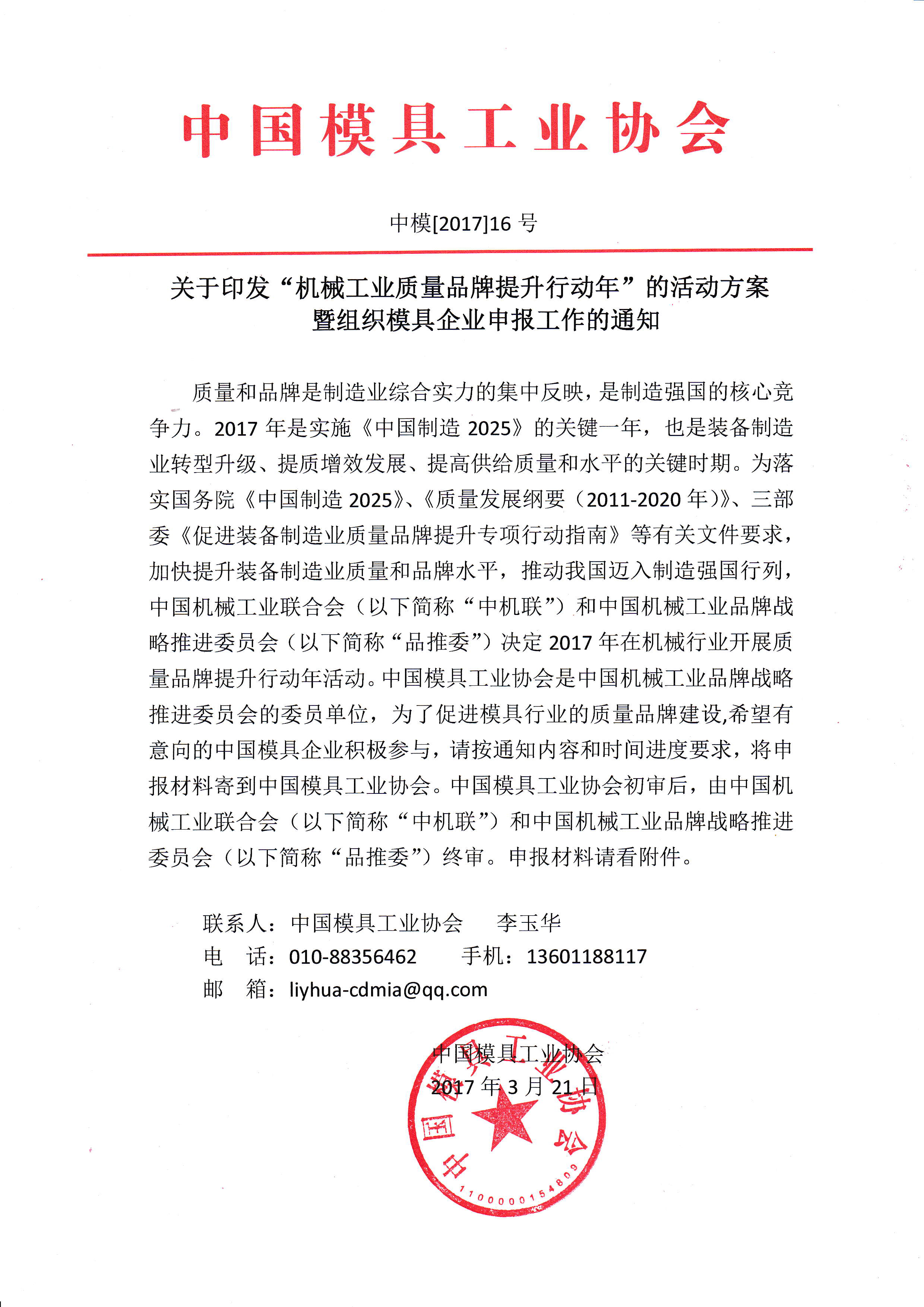 关于印发“机械工业质量品牌提升行动年”的活动方案暨组织模具企业申报工作的通知