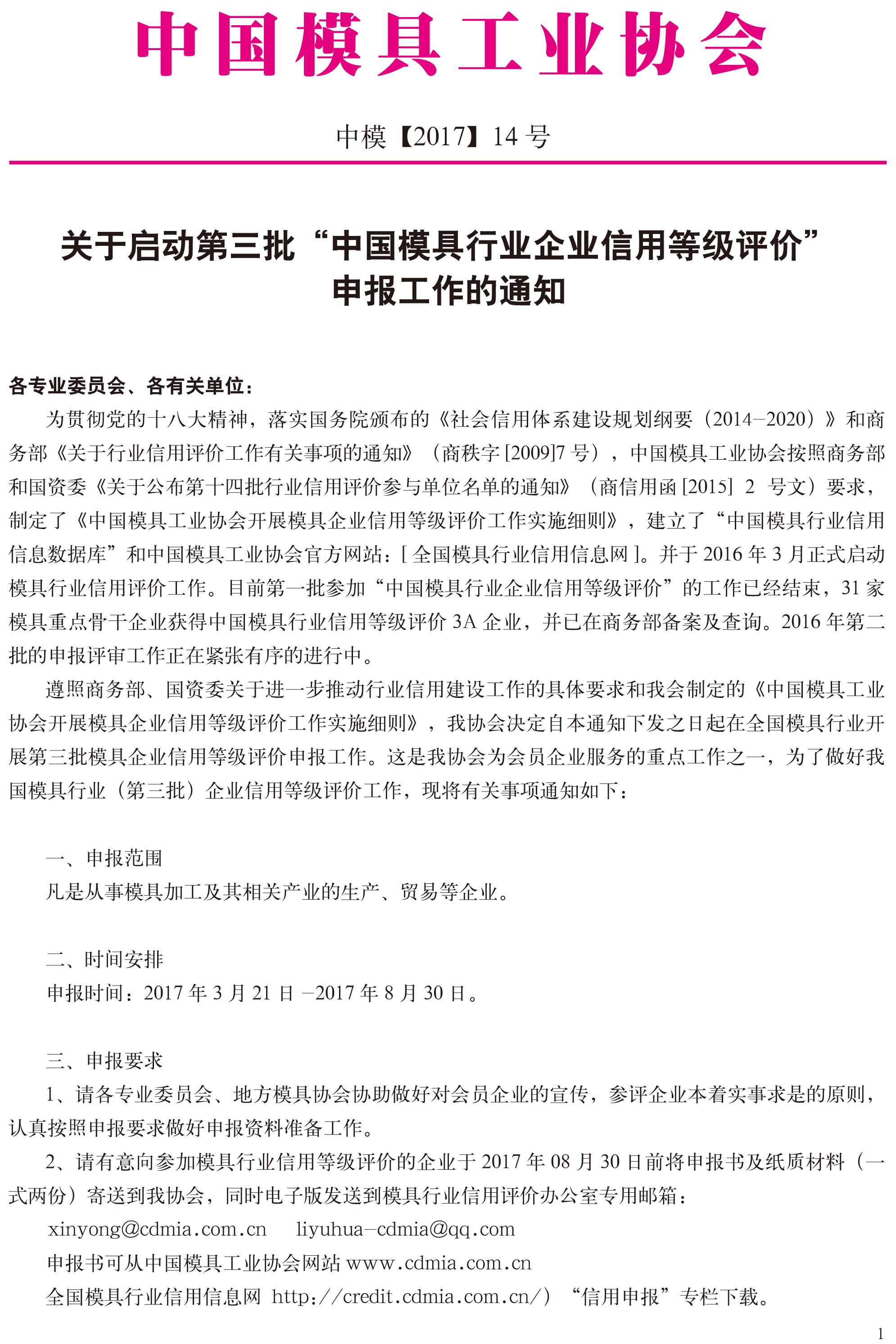 关于启动第三批“中国模具行业企业信用等级评价”申报工作的通知