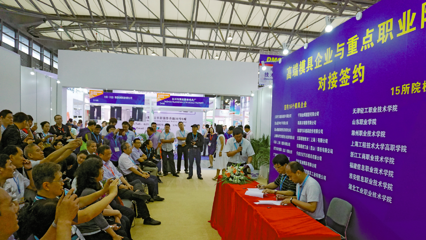 DMC2017开展当天, 13家模具企业(天津汽车模具股份有限公司、宁海金辉模塑有限公司、昆山嘉华电子有限公司、珠海市精模有限公司、昆山德盛精密模具有限公司、瑞鹄汽车模具股份有限公司、上海赛科利汽车模具技术应用有限公司、天泽精密技术(上海)有限公司、亿森(上海)模具有限公司、优德精密工业(昆山)股份有限公司、北汽兴东方模具(北京)有限公司、宁波方正汽车模具有限公司、广东星联精密机械有限公司、河北安迪模具有限公司、江苏荣腾精密组件科技股份有限公司、昆山汇美塑胶模具工业有限公司)与中国模具工业协会职业院校教育委员会的14所高等职业院校(天津轻工职业技术学院、长春汽车工业高等专科学校、西安航空职业技术学院、滁州职业技术学院、江苏信息职业技术学院、上海工程技术大学高职学院、宁波职业技术学院、浙江工商职业技术学院、广州番禺职业技术学院、福建信息职业技术学院、武汉城市职业学院、淮安信息职业技术学院、安徽国防科技职业技术学院、湖北工业职业技术学院)进行了面对面的深入的交流,彼此了解了院校的专业设置和毕业生走向以及企业的需求,并在“权责分明、资源共享、优势互补、平等互利、共同发展”的框架下,形成了战略合作意见。