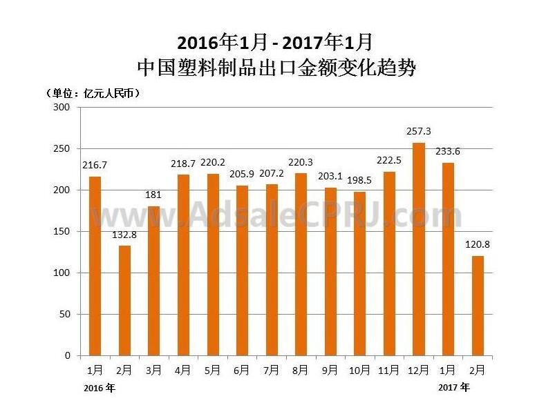 1~2月中国出口塑料制品154万吨,同比增长7.2%;出口金额为354.4亿元,同比增长12.6%。2月当月出口53万吨,同比下降8.6%;出口金额为120.8亿元,同比下降9.0%。2月出口均价为每吨2.28万元,同比略微下降。