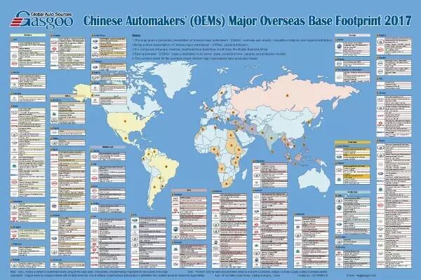 中国汽车制造商海外主要生产基地格局图(2017版)系统反应当前国内各大主机厂在海外的整车资产、竞争关系和区域布局等,直观体现中国汽车企业在全球各地的分布情况。