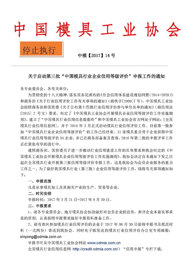 关于启动第三批“中国模具行业企业信用等级评价”申报工作的通知