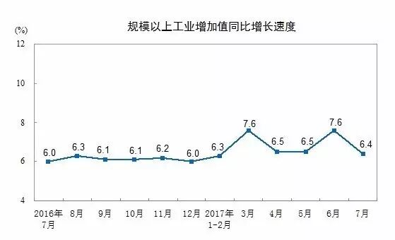 7月当月,中国规模以上工业增加值同比实际增长6.4%,比6月份回落1.2个百分点,比上年同月加快0.4个百分点。从环比看,7月份,规模以上工业增加值比上月增长0.41%。