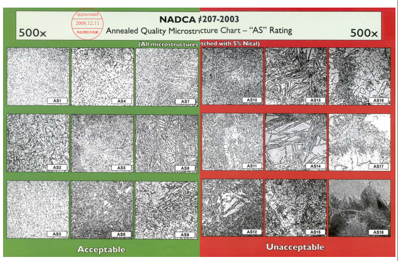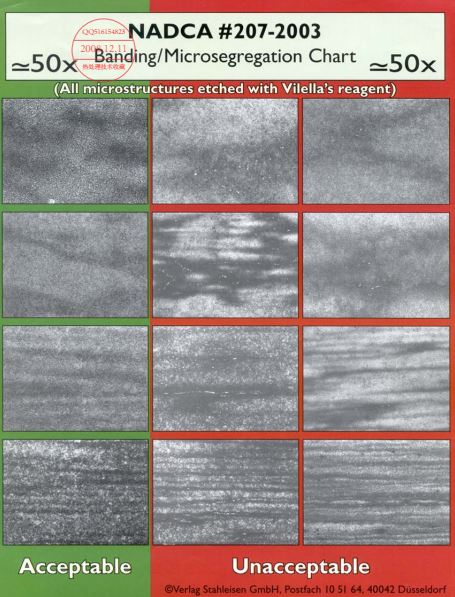 NADCA 207#-2003标准中进行了修订,划分依据是偏析带中是否存在可见的大颗粒一次碳化物,存在即判为不合格,并且不再区分不同钢种的带状组织。如下图: