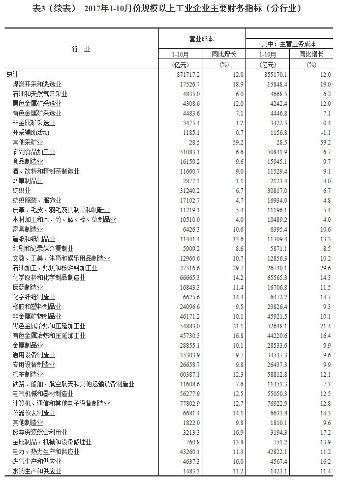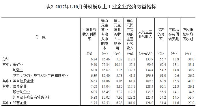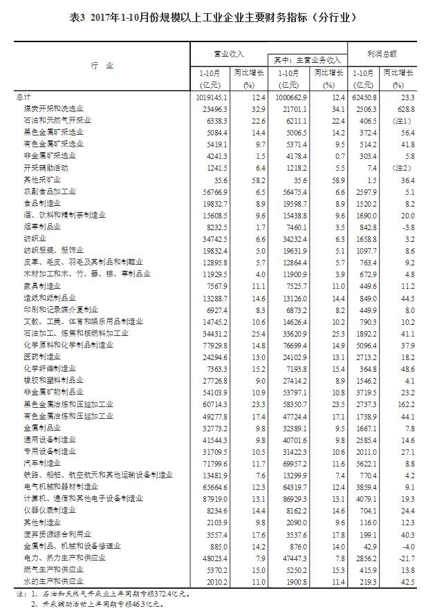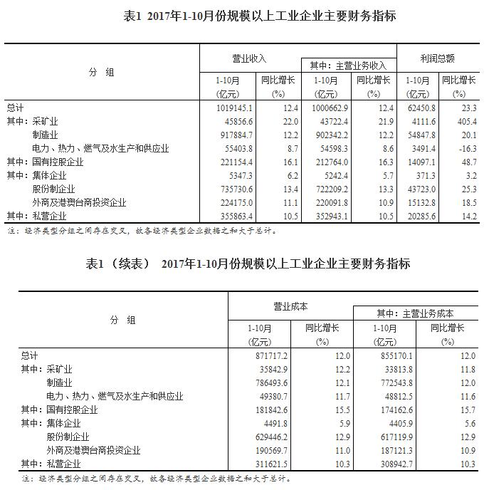 | 1-10月份,全国规模以上工业企业实现利润总额62450.8亿元,同比增长23.3%,增速比1-9月份加快0.5个百分点。   1-10月份,规模以上工业企业中,国有控股企业实现利润总额14097.1亿元,同比增长48.7%;集体企业实现利润总额371.3亿元,增长3.2%;股份制企业实现利润总额43723亿元,增长25.3%;外商及港澳台商投资企业实现利润总额15132.8亿元,增长18.5%;私营企业实现利润总额20285.6亿元,增长14.2%。   1-10月份,采矿业实现利润总额4111.6亿元,同比增长4.1倍;制造业实现利润总额54847.8亿元,增长20.1%;电力、热力、燃气及水生产和供应业实现利润总额3491.4亿元,下降16.3%。   1-10月份,在41个工业大类行业中,38个行业利润总额同比增加,3个行业减少。主要行业利润情况如下:煤炭开采和洗选业利润总额同比增长6.3倍,农副食品加工业增长5.1%,纺织业增长3.2%,石油加工、炼焦和核燃料加工业增长41.1%,化学原料和化学制品制造业增长37.9%,非金属矿物制品业增长23.2%,黑色金属冶炼和压延加工业增长1.6倍,有色金属冶炼和压延加工业增长44.1%,通用设备制造业增长14.6%,专用设备制造业增长27.1%,汽车制造业增长8.8%,电气机械和器材制造业增长9.1%,计算机、通信和其他电子设备制造业增长19.3%,石油和天然气开采业由同期亏损转为盈利,电力、热力生产和供应业利润总额同比下降21.7%。   1-10月份,规模以上工业企业实现主营业务收入100.1万亿元,同比增长12.4%;发生主营业务成本85.5万亿元,增长12%;主营业务收入利润率为6.24%,同比提高0.55个百分点。   10月末,规模以上工业企业资产总计111.5万亿元,同比增长7.7%;负债合计62.1万亿元,增长6.7%;所有者权益合计49.4万亿元,增长9%;资产负债率为55.7%,同比下降0.5个百分点。   10月末,规模以上工业企业应收账款13.5万亿元,同比增长8.4%;产成品存货41908.2亿元,增长9%。   1-10月份,规模以上工业企业每百元主营业务收入中的成本为85.46元,同比减少0.26元;每百元主营业务收入中的费用为7.38元,同比减少0.25元;每百元资产实现的主营业务收入为112.1元,同比增加4.6元;人均主营业务收入为133.9万元,同比增加15.9万元;产成品存货周转天数为13.9天,同比减少0.6天;应收账款平均回收期为38天,同比减少1天。   10月份,规模以上工业企业实现利润总额7454.1亿元,同比增长25.1%,增速比9月份放缓2.6个百分点。             附注   1、指标解释     利润总额:指企业在生产经营过程中各种收入扣除各种耗费后的盈余,反映企业在报告期内实现的盈亏总额。     营业收入:指企业经营主要业务和其他业务所确认的收入总额。     主营业务收入:指企业经营主要业务所取得的收入总额。     营业成本:指企业经营主要业务和其他业务所发生的成本总额。     主营业务成本:指企业经营主要业务所发生的成本总额。     资产总计:指企业过去的交易或者事项形成的、由企业拥有或者控制的、预期会给企业带来经济利益的资源。     负债合计:指企业过去的交易或者事项形成的,预期会导致经济利益流出企业的现时义务。     所有者权益合计:指企业资产扣除负债后由所有者享有的剩余权益。     应收账款:指企业因销售商品、提供劳务等经营活动所形成的债权,包括应向客户收取的货款、增值税款和为客户代垫的运杂费。     产成品存货:指企业报告期末已经加工生产并完成全部生产过程,可以对外销售的制成产品。     主营业务收入利润率=利润总额÷主营业务收入×100%,单位:%。     每百元主营业务收入中的成本=主营业务成本÷主营业务收入×100,单位:元。     每百元主营业务收入中的费用=(销售费用+管理费用+财务费用)÷主营业务收入×100,单位:元。     每百元资产实现的主营业务收入=主营业务收入÷平均资产÷累计月数×12×100,单位:元。     人均主营业务收入=主营业务收入÷平均用工人数÷累计月数×12,单位:万元/人。     资产负债率=负债合计÷资产总计×100%,单位:%。     产成品存货周转天数=360×平均产成品存货÷主营业务成本×累计月数÷12,单位:天。     应收账款平均回收期=360×平均应收账款÷主营业务收入×累计月数÷12,单位:天。     在各表的利润总额同比增长栏中,标“注”的表示上年同期利润总额为负数,即亏损;数值为正数的表明利润同比增长;数值在0至-100%之间(不含0)的表明利润同比下降;下降幅度超过100%的表明由上年同期盈利转为本期亏损;数值为0的表明利润同比持平。     由于规模以上工业企业范围每年发生变化,为保证本年数据与上年可比,计算各项指标同比增长速度和增长量所采用的同期数与本期的企业统计范围相一致,和上年公布的数据存在口径差异。   2、统计范围     规模以上工业企业,即年主营业务收入为2000万元及以上的工业法人单位。   3、调查方法     规模以上工业企业财务状况报表按月进行全面调查(1月份数据免报)。   4、行业分类标准     执行国民经济行业分类标准(GB/T4754-2011),具体请参见http://www.stats.gov.cn/tjsj/tjbz/hyflbz/2011/。 |