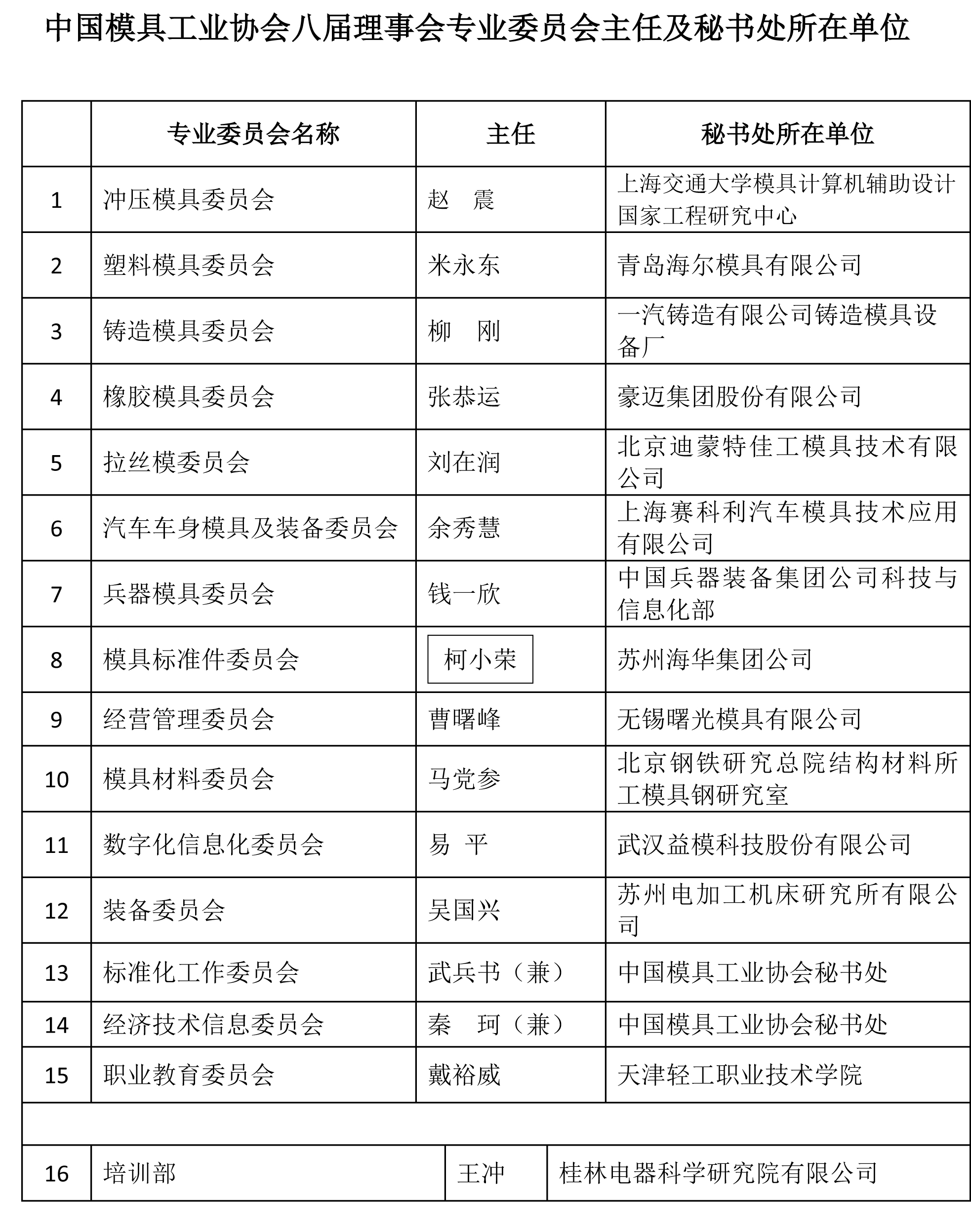 中国模具工业协会八届理事会专业委员会主任及秘书处所在单位