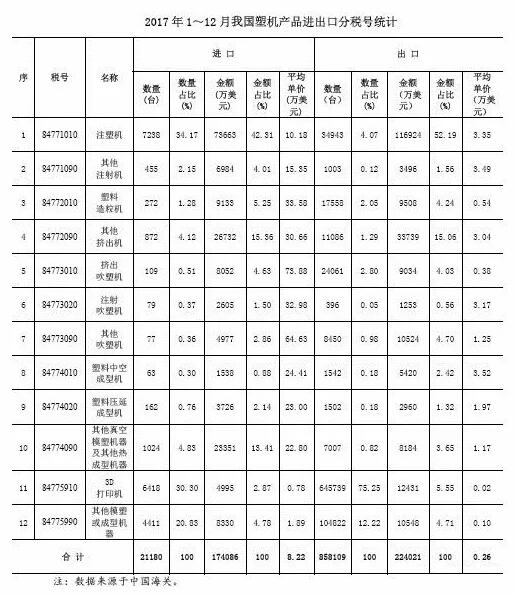2017年从亚洲进口塑机16623台,金额约10.2亿美元,分别占同期进口塑机的78.5%、58.29%,其中从日本进口数量和金额分别同比增长47.2%、43.97%,主要产品为注塑机和其他真空模塑机器;从韩国进口数量同比减少9.06%,但金额同比增长32.38%,主要产品为注塑机。