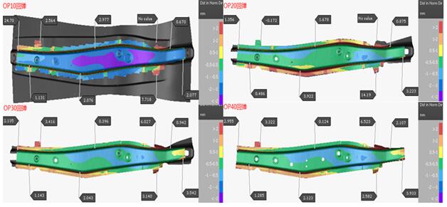 零件的全工序分析通过后,对零件进行回弹分析。首先对零件进行自由回弹分析来判断零件的回弹趋势,零件从第一工序到第四工序的回弹结果如图7所示。由图可知,零件各工序的回弹趋势比较一致;在OP10拉延成形后,零件有几个局部区域的回弹较大,主要集中在零件的两端和侧壁位置;经过OP20切边之后由于应力释放使侧壁的回弹值有所上升,其它位置的回弹变化不大;零件在OP30整形后侧壁的回弹值有减少趋势,但两端的回弹值增加,特别是零件前端的法兰部分;零件在OP40进行局部的切边和冲孔,该工序属于零件的应力释放过程,回弹值变化不大。