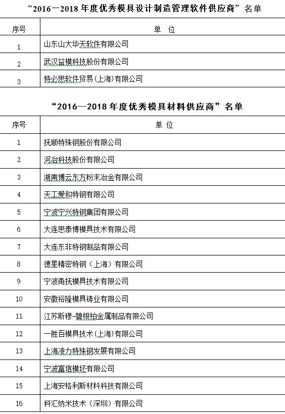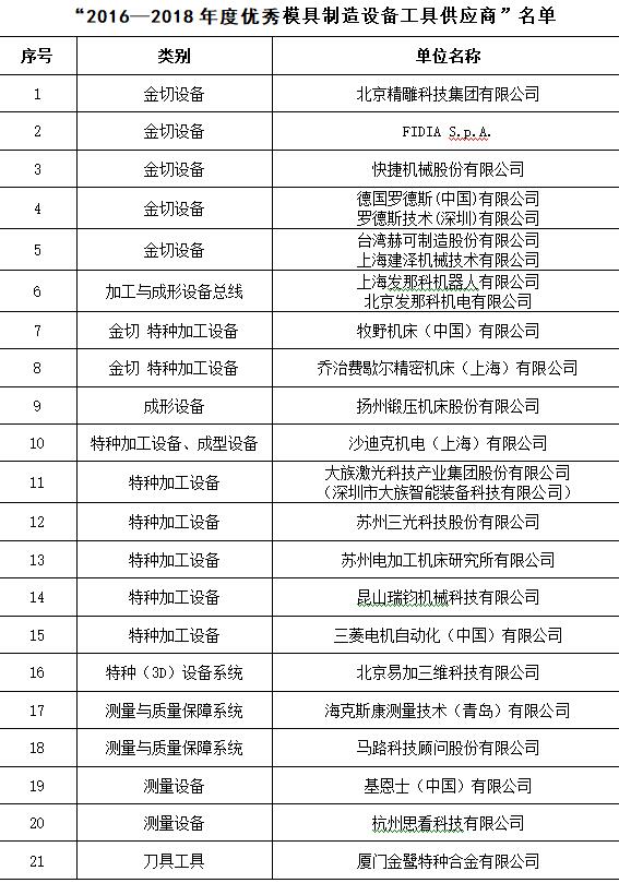 在知名品牌专业展会——中国国际模具技术和设备展览会DMC上开展优秀供应商的评选活动,得到了各行业的广泛认可,被评定为优秀供应商的企业,将在模具企业的采购中获得优先推荐资格并在行业里得到广泛的宣传推广,并在中国模协的官网上进行公告,至今已成定式。DMC2018期间,中国模具工业协会委托中国模协装备委员会、数字化信息化委员会、材料委员会,本着自愿的原则,依据供应商的技术水平、在模具行业的服务能力、市场占有率的高低、模具行业服务满意度等行业贡献指标,并结合模具企业的意见,最终评选出21家“2016—2018年度优秀模具制造设备工具供应商”、3家“2016—2018年度优秀模具设计制造管理软件供应商”、16家“2016—2018年度优秀模具材料供应商”(同时见www.w1354.cn,diemouldchina.com.cn),具体名单如下所示,排名均不分先后。