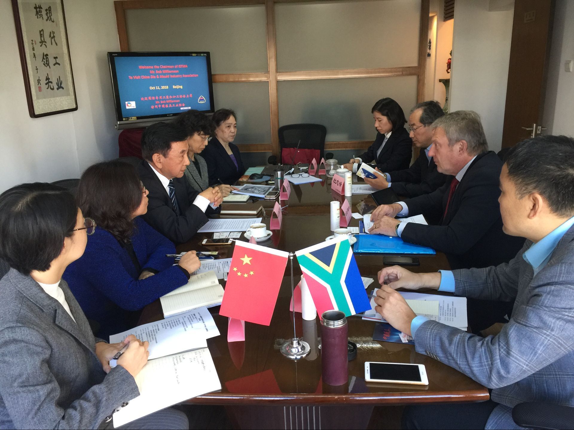 在金砖国家合作五周年,北汽整车南非基地一期建设即将完成之际。2018年10月11日,国际专用工装和加工协会(ISTMA)主席Mr.Bob Williamson到访中国模具工业协会秘书处。中国模具工业协会会长武兵书,秘书长秦珂,副秘书长李玉华、张淑杰,北汽国际采购部负责模具专家左喜顺,北汽模具总经理杜志峰,中国模具工业协会国际部项目主管高媛、田慧卿参加座谈。