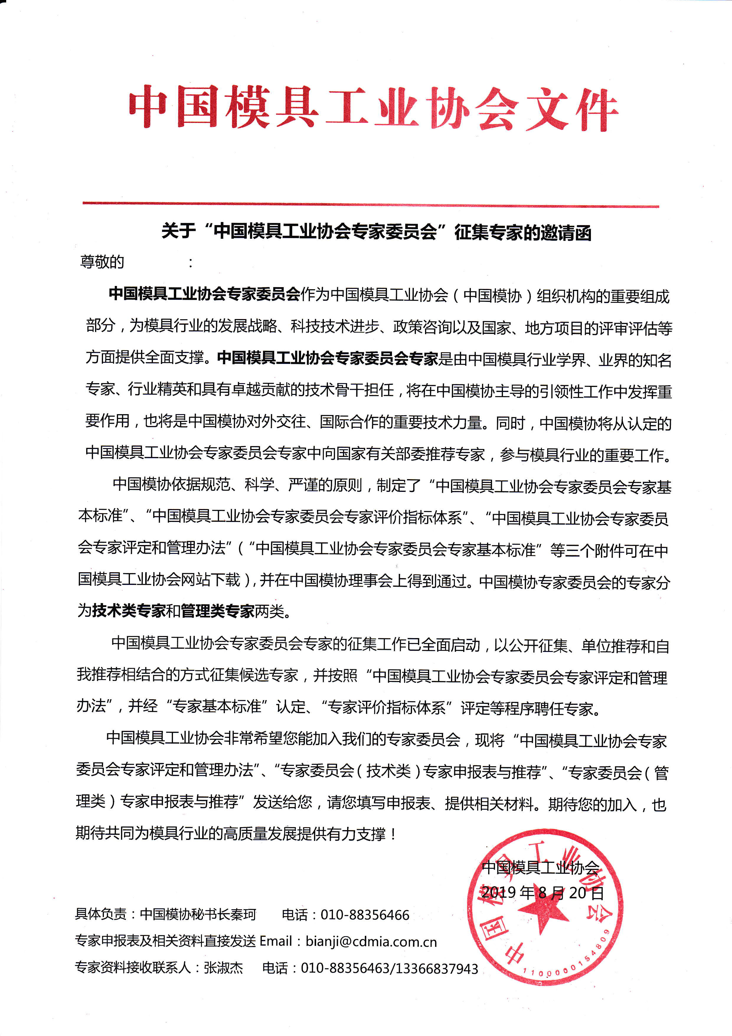 关于“中国模具工业协会专家委员会”征集专家的邀请函