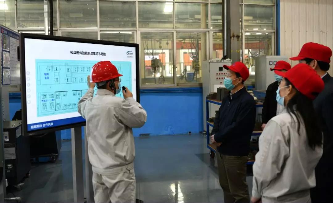 晓光模具公司智能成型研究院执行院长朱歆着重汇报了模具工厂“智能成型”项目,并分析展示了该项技术的开创性行业地位和广阔的应用前景。王志军副部长认真听取了汇报,详细询问了相关技术要点,充分肯定公司勇于创新,抢占技术制高点的战略眼光。他欣然表示,一定会持续关注“晓光”、关注“智能成型项目”的进展,并当场要求各级业务部门出台专项政策予以支持。