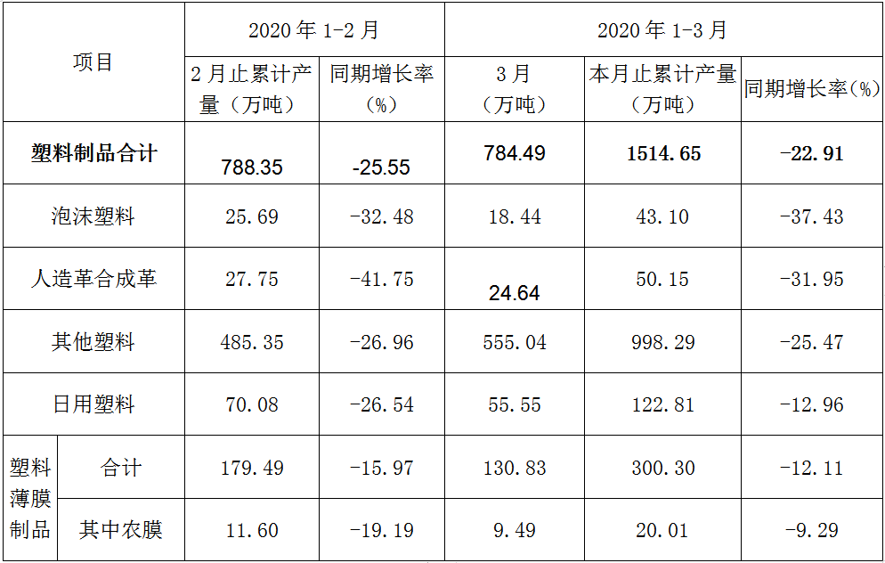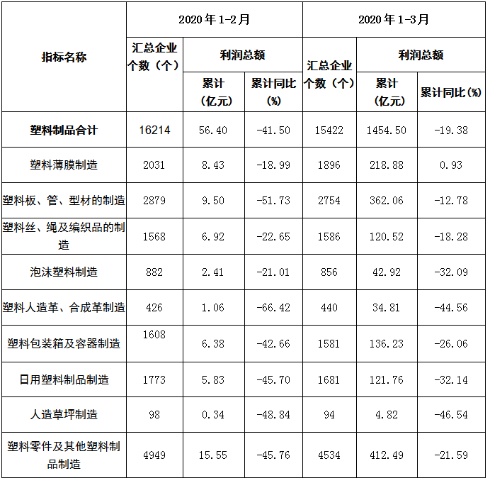 2020年1-3月,全国塑料制品行业汇总统计企业累计完成产量1514.65万吨,同比下降22.91%,增长率比上年同期降低了26.43%;16226家规模以上企业营业收入3349.34亿元,同比下降21.03%,增长率比上年同期降低了29.91%;实现利润145.45亿元,同比下降19.38%,增长率比上年同期降低了35.45%;营业收入利润率为4.34%,比上年同期下降了0.03%;塑料制品累计出口额144.58亿美元,同比下降9.46%,增长率比上年同期降低17.04%。(统计口径不一,各年数据不可直接相比)