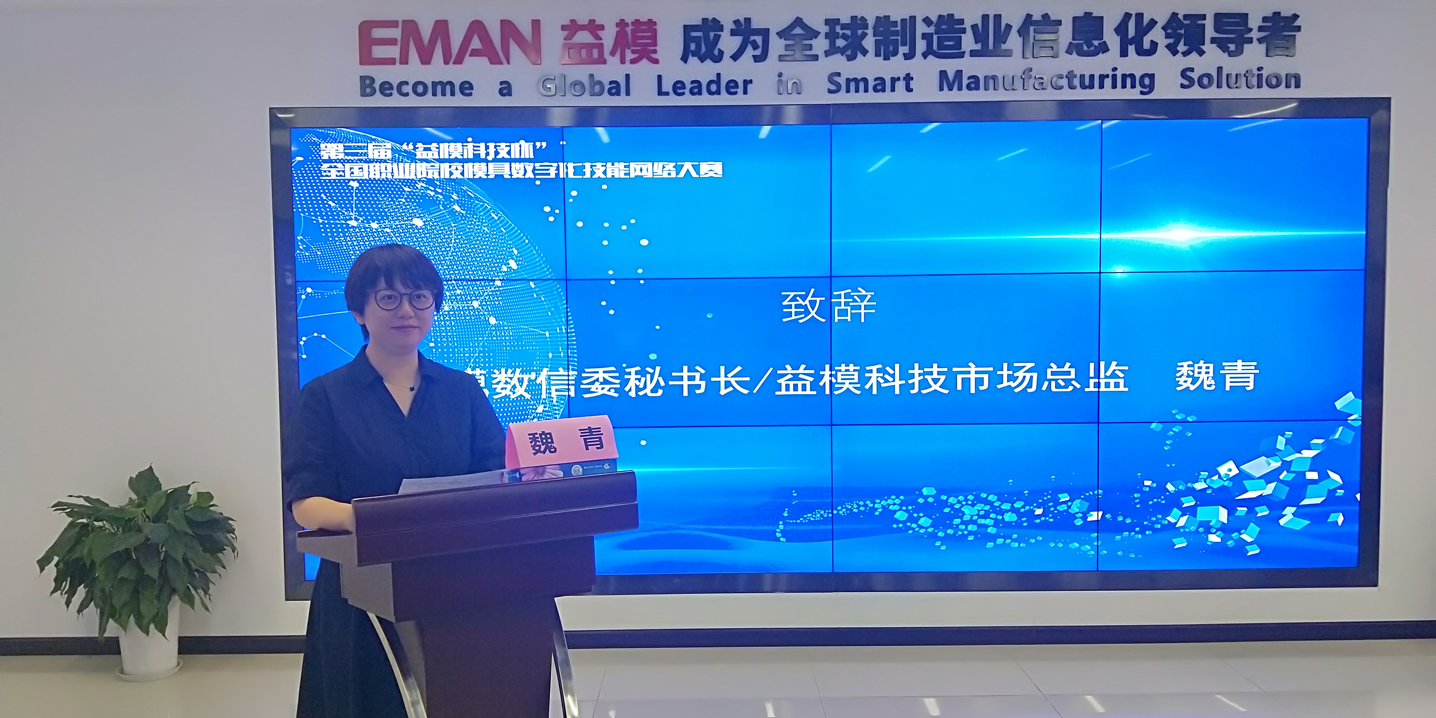大赛技术支持单位益模科技市场总监魏青女士致辞,欢迎各参赛院校参加比赛,并预祝比赛圆满成功。