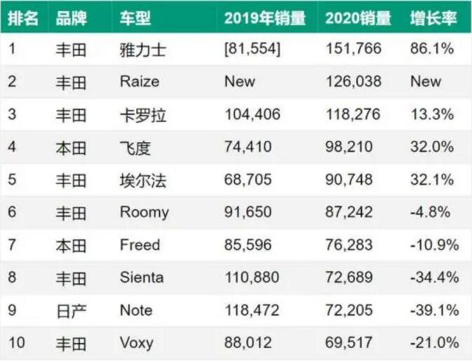 而在车型方面,虽然日本每年车型销量排行榜单变化都很大,但2020年仍然是近年来变化最大的一次。销量排名前10的车型没有一款排名与前一年相同,而2019年的销量冠军丰田普锐斯更是跌出了榜单前十名,今年的销量冠军为去年排名第十位的丰田雅力士。细分车型方面,轿车和MPV仍是日本市场绝对主流,榜单前10中仅有丰田Raize一款SUV车型。
