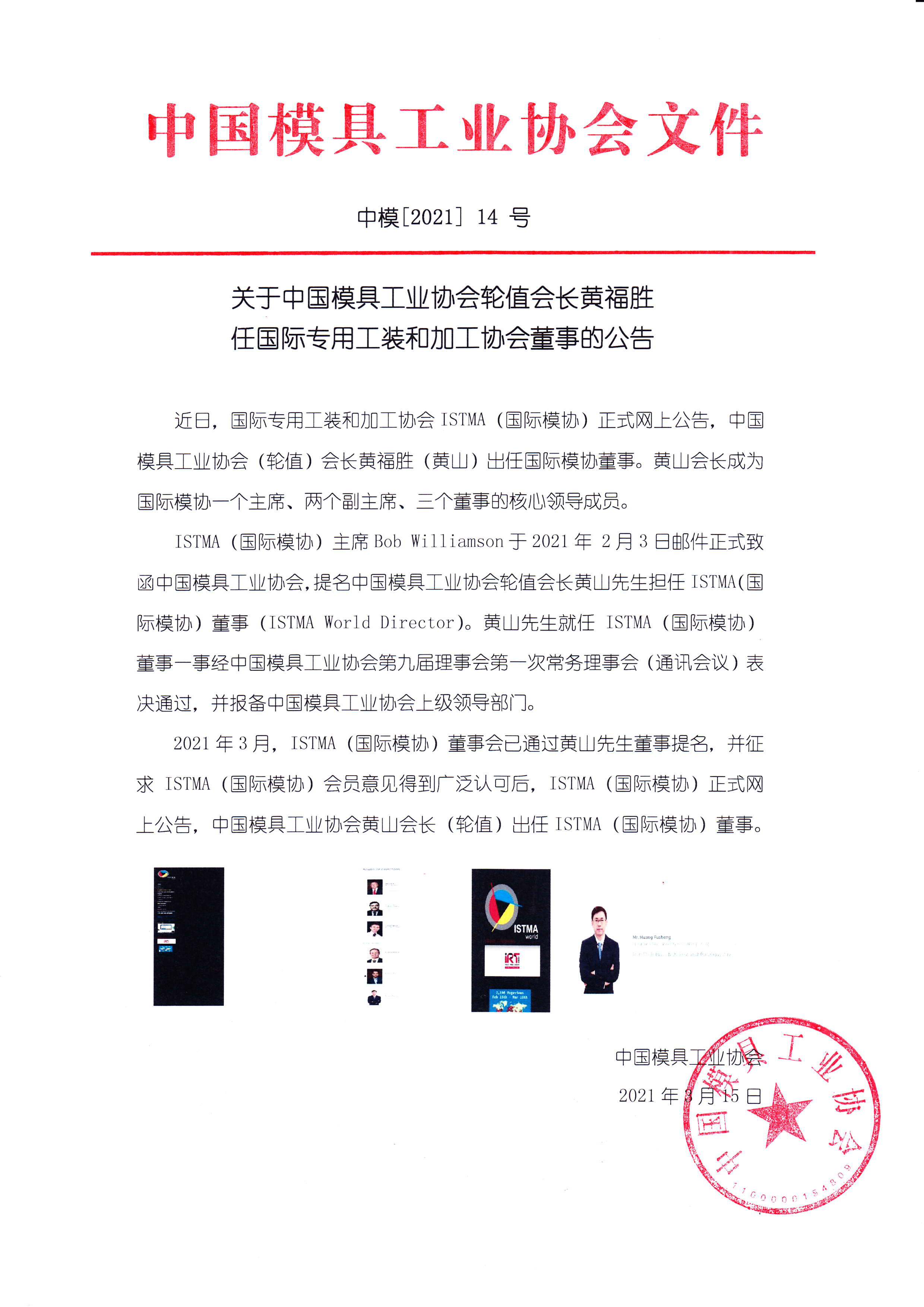 关于中国模具工业协会轮值会长黄福胜任国际专用工装和加工协会董事的公告