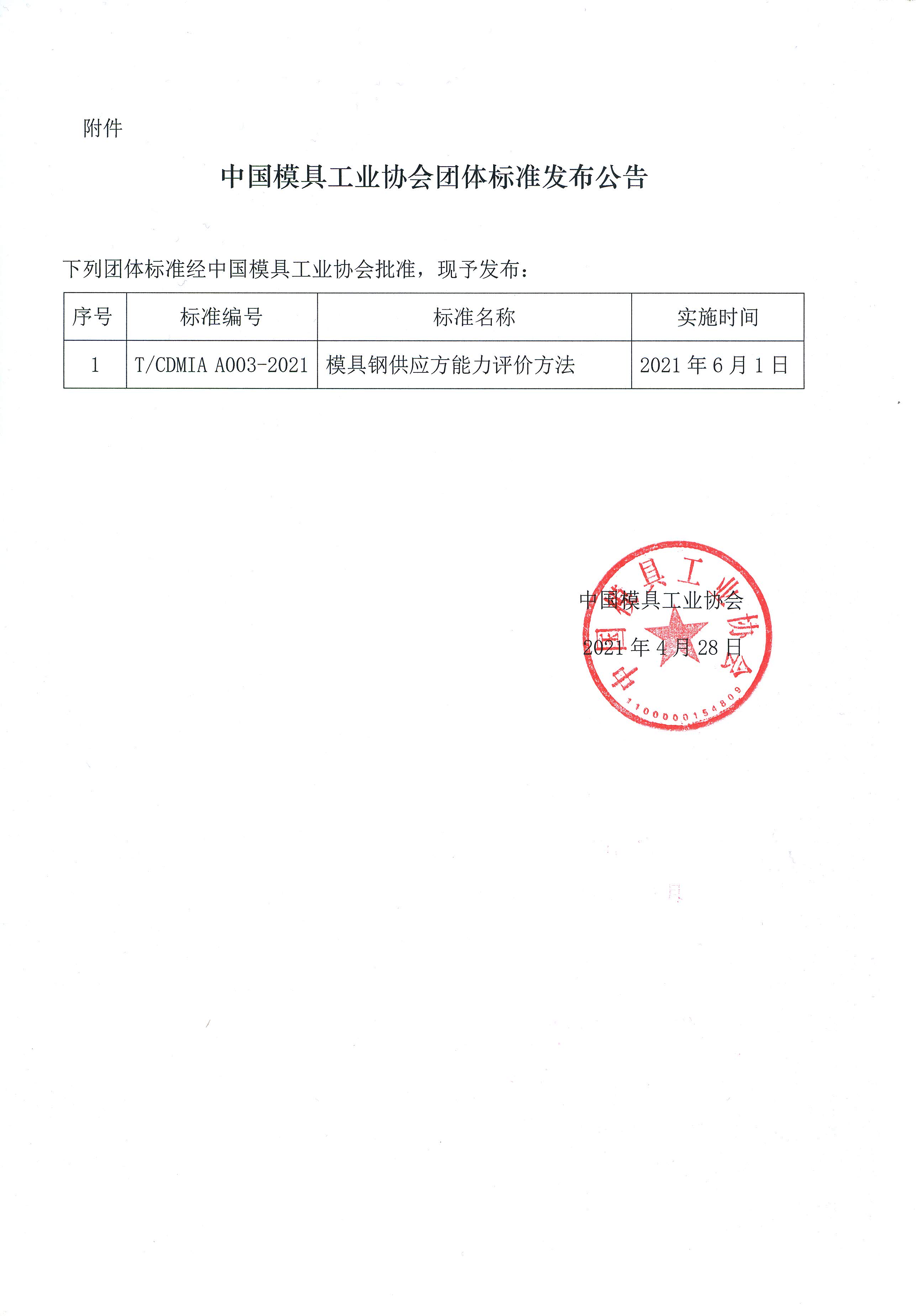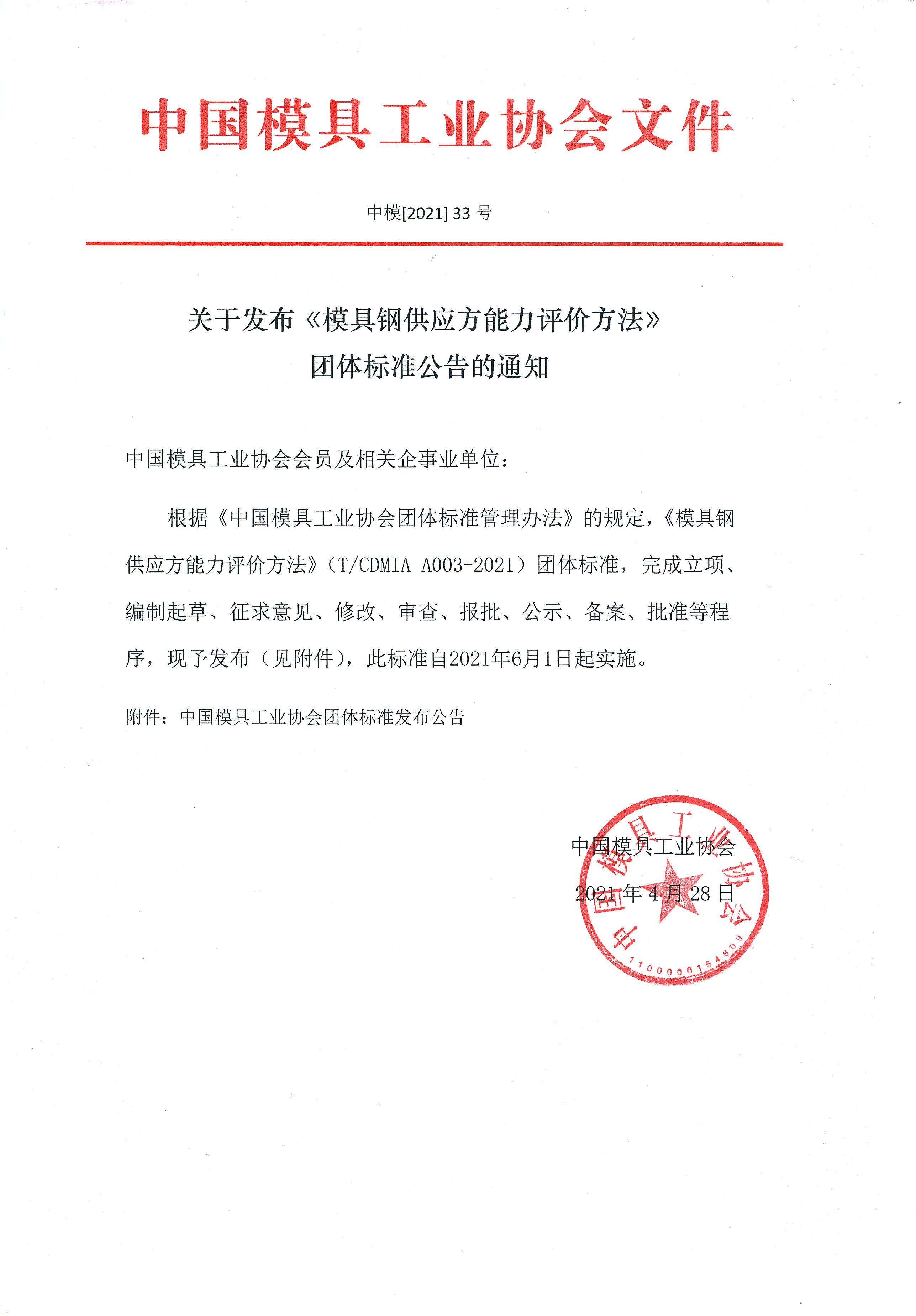 关于发布《模具钢供应方能力评价方法》团体标准公告的通知