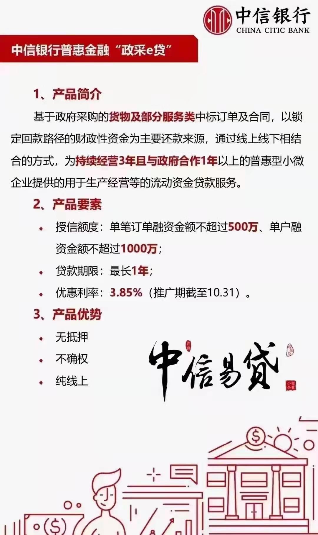中信银行创新推出“政采e贷”产品,着力帮助解决部分小微企业在中标政府采购订单后,因信息不对称等原因导致的“融资难”问题,助力实体经济复苏。