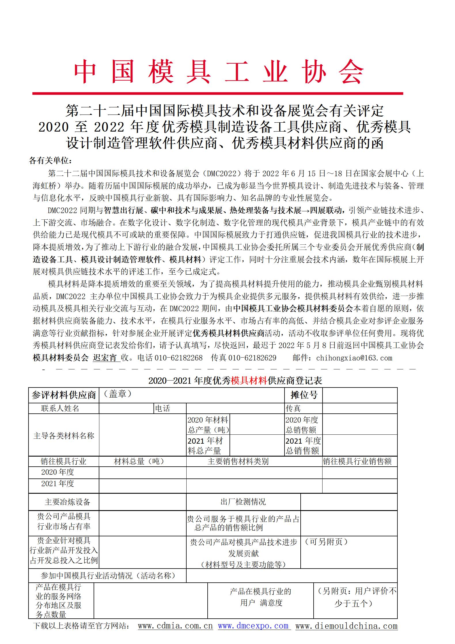 第二十二届中国国际模具技术和设备展览会有关评定 2020至2022年度优秀模具制造设备工具供应商、优秀模具设计制造管理软件供应商、优秀模具材料供应商的函