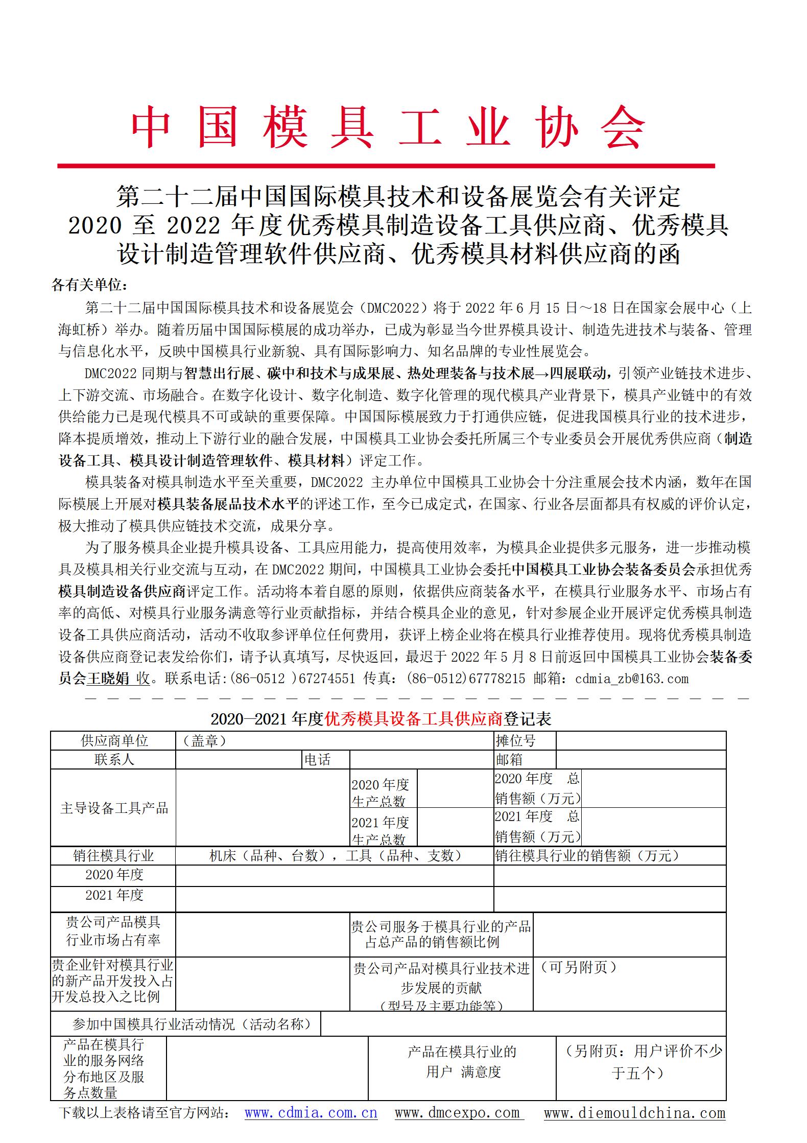 第二十二届中国国际模具技术和设备展览会有关评定 2020至2022年度优秀模具制造设备工具供应商、优秀模具设计制造管理软件供应商、优秀模具材料供应商的函
