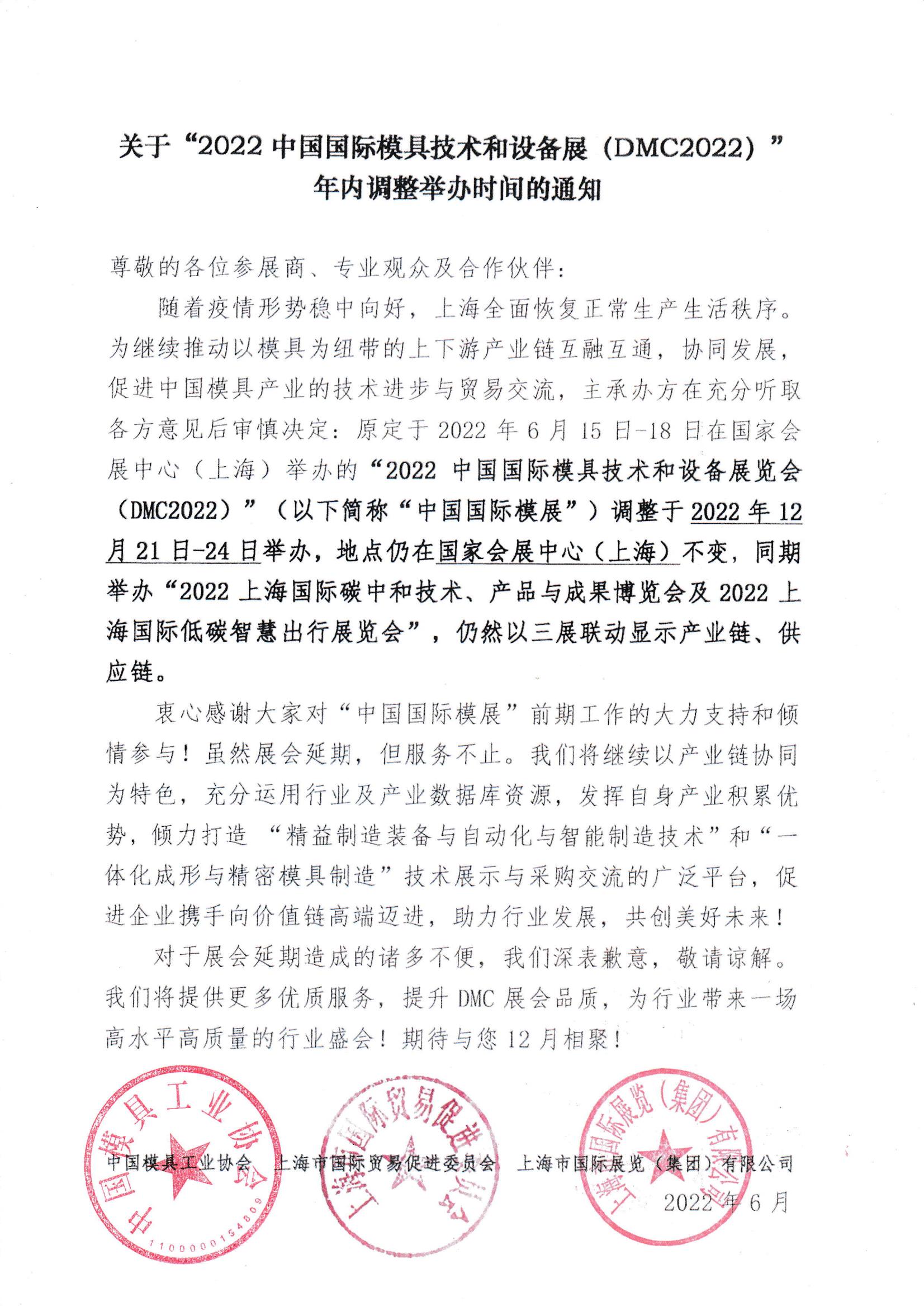 关于“2022中国国际模具技术和设备展(DMC2022)年内调整举办时间的通知”