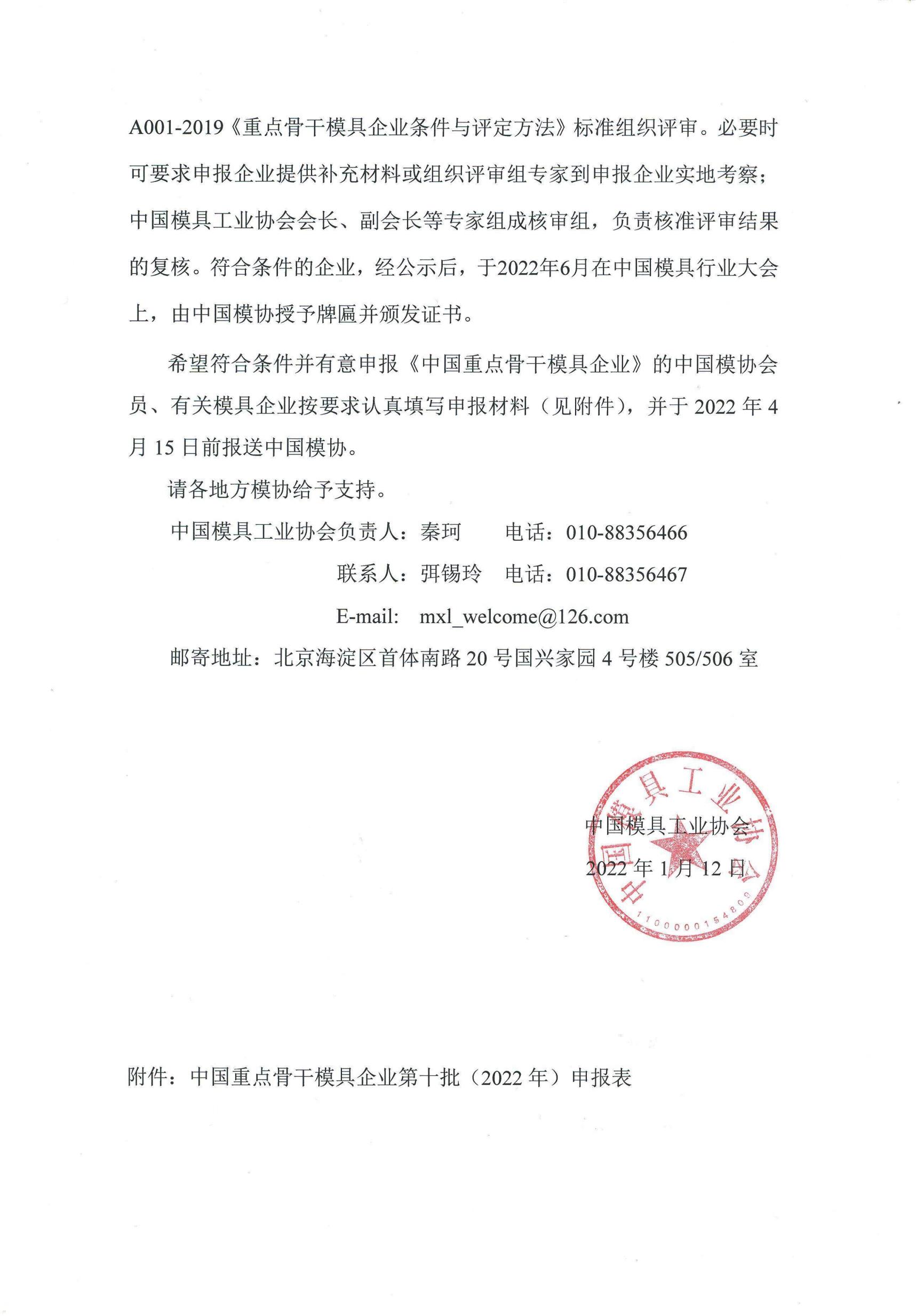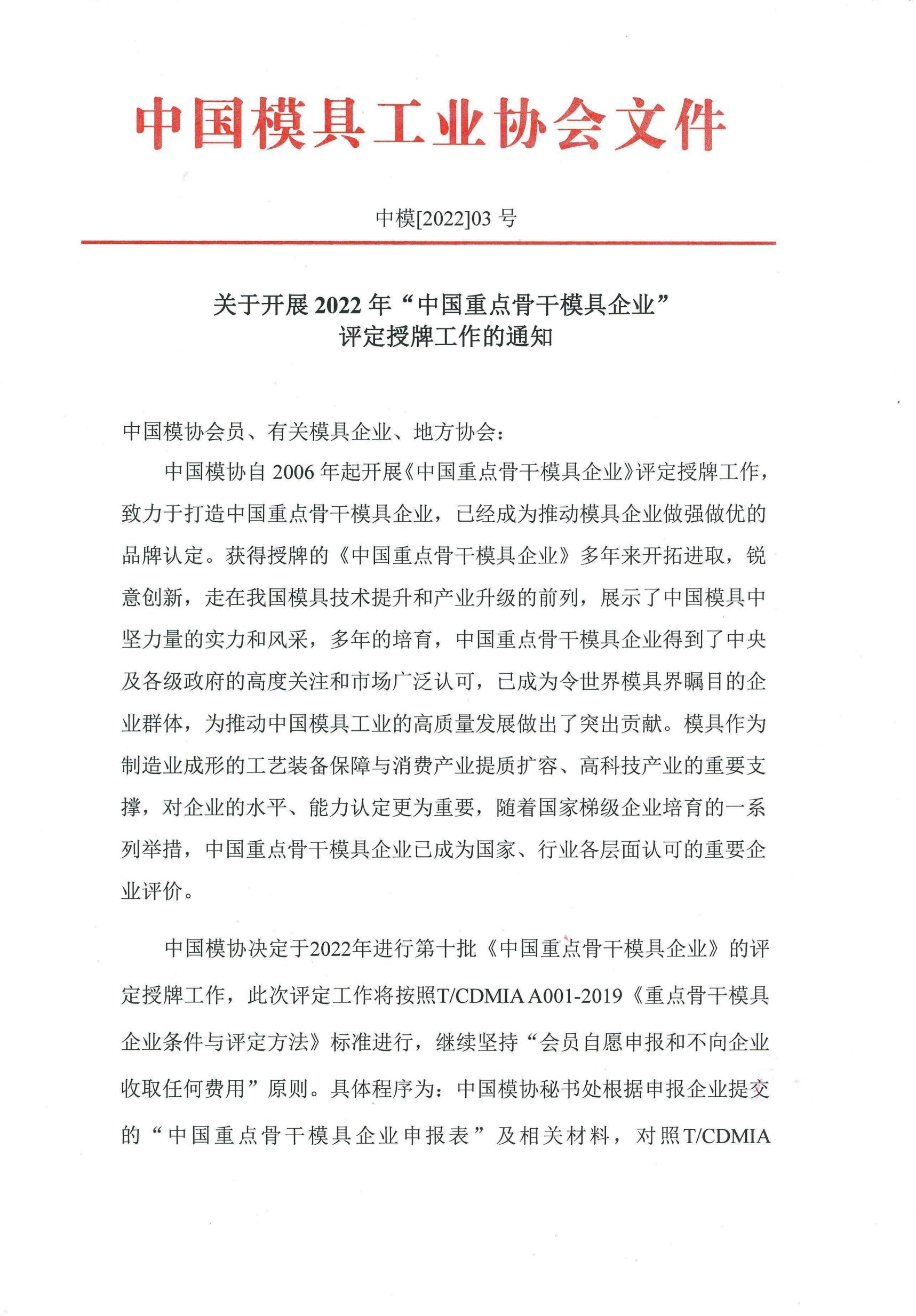 关于开展2022年“中国重点骨干模具企业”评定授牌工作的通知