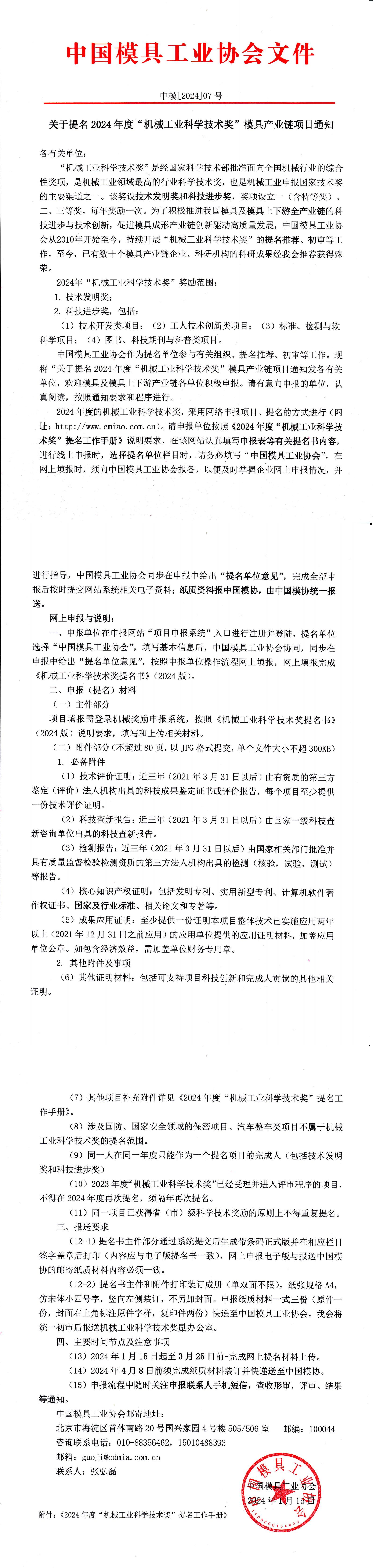 关于提名2024年度“机械工业科学技术奖”模具产业链项目通知