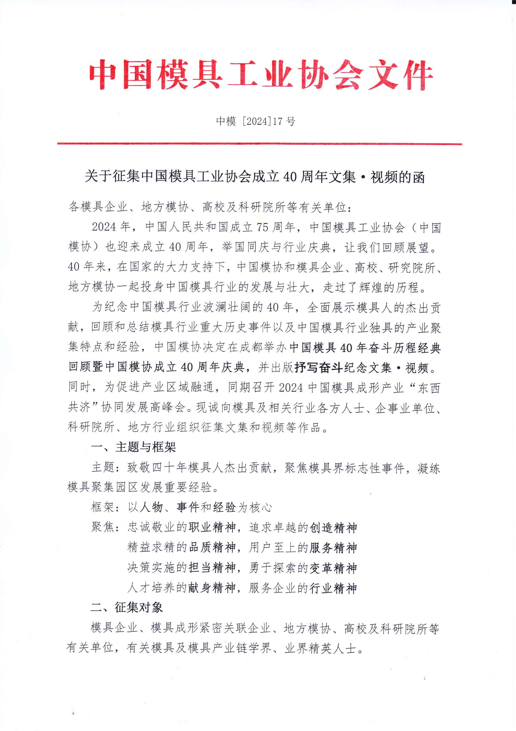 关于征集中国模具工业协会成立40周年文集 视频的函