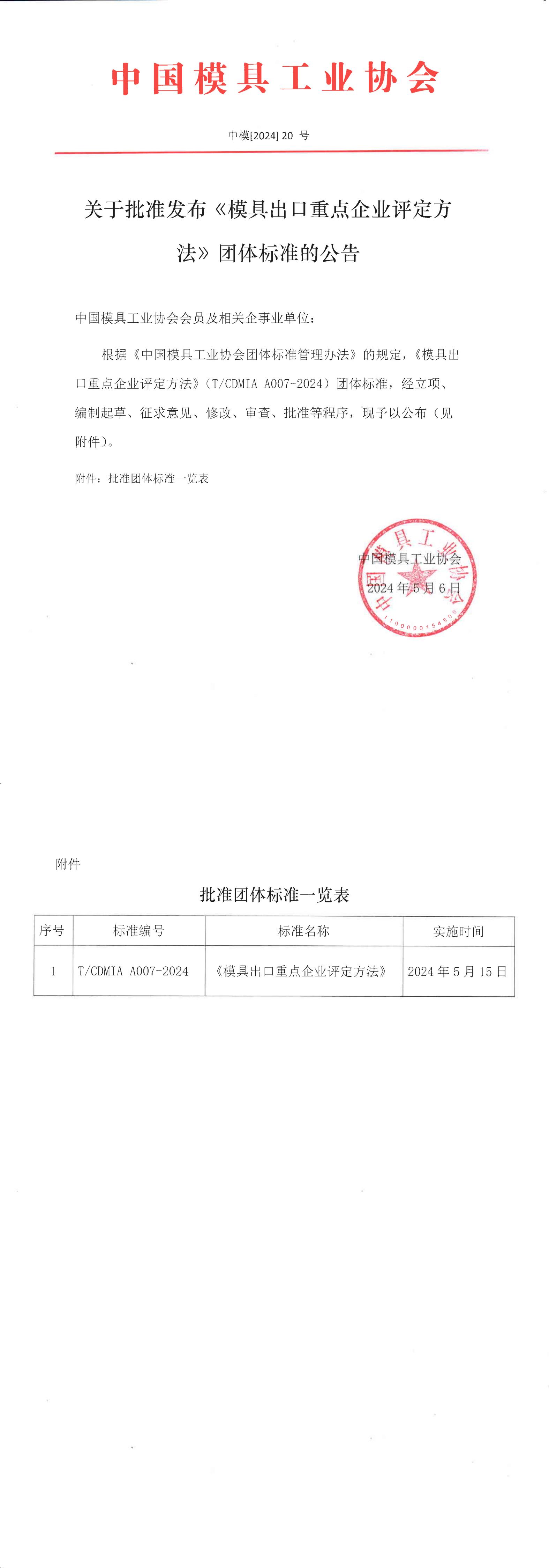 关于批准发布《模具出口重点企业评定方法》团体标准的公告
