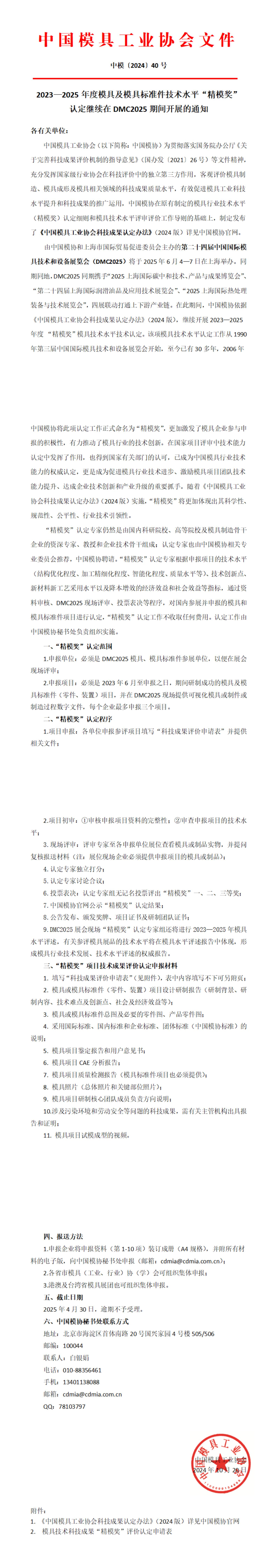 2023-2025年度模具及模具标准件技术水平“精模奖”认定继续在DMC2025期间开展的通知